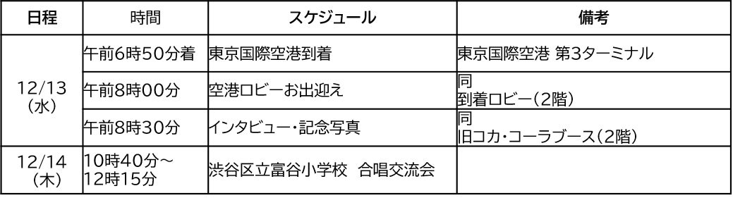 その中から、歌唱力のみならず、特に「Tomodachi」のコンセプトを歌声で精一杯表現してくれた以下の5名の子供たちが、本プロジェクトの代表として、2023年12月13日~20日まで来日します。日本の子供たちとの合唱交流をはじめ国内各所への訪問、文化体験を行う予定です。各所で5名の歌声が披露されます。