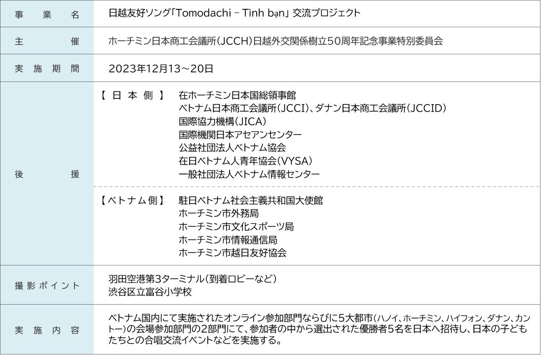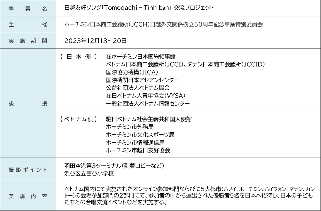 ホーチミン日本商工会議所(JCCH) 日越外交関係樹立50周年記念事業特別委員会は、日越外交関係樹立50周年を契機に、日越友好ソング「Tomodachi」をベトナム全土に発信、浸透させるプロジェクトを、2023年9月から3か月間実施いたしました。