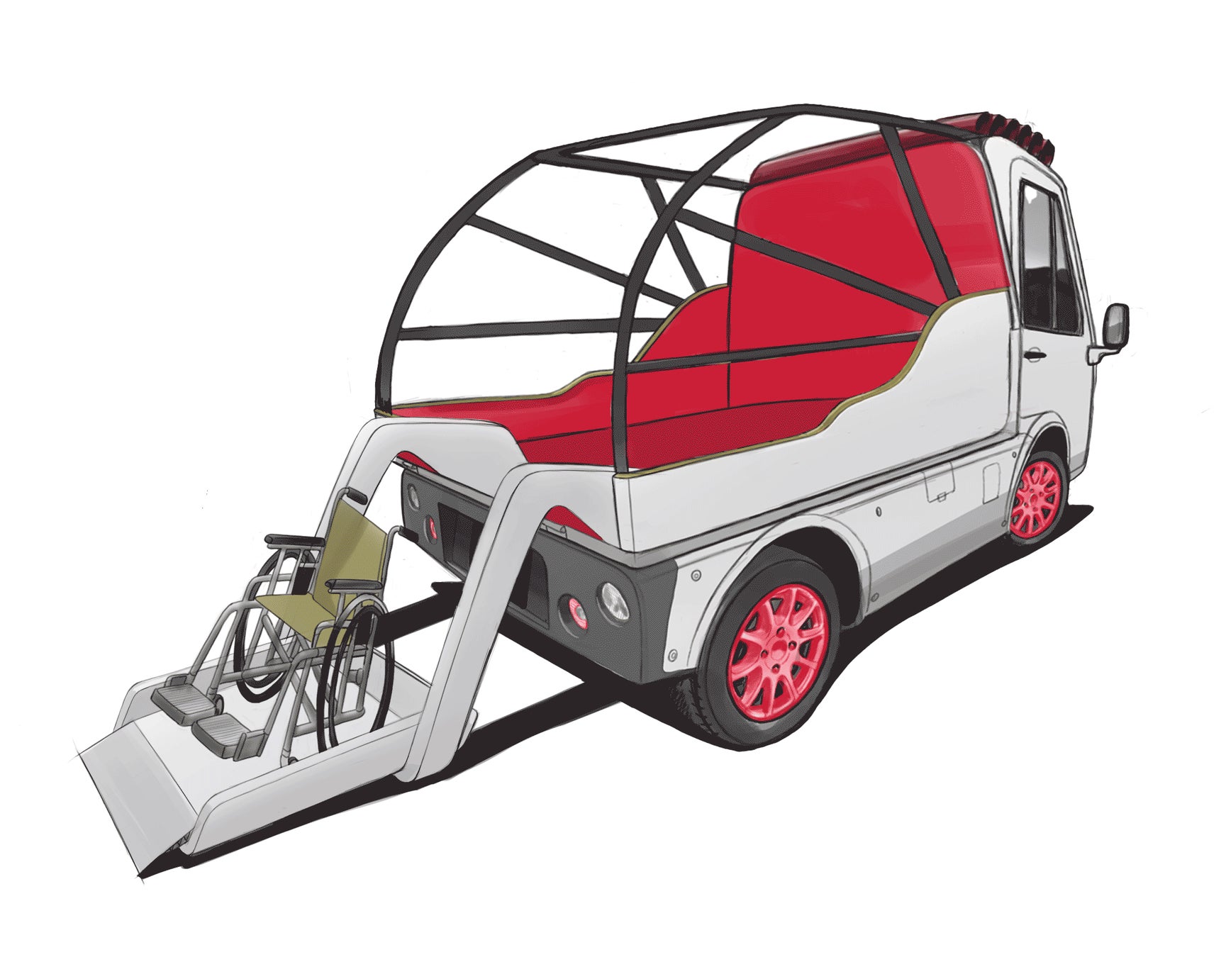 これまでの福祉車両には無い、カッコよさ、ワクワクする搭乗感。オープンエアの観光バスと人力車をイメージして作られた「電力車‐ami1000™」。このカスタムカーで日本の観光をもっとボーダーレスにエキサイティングに!