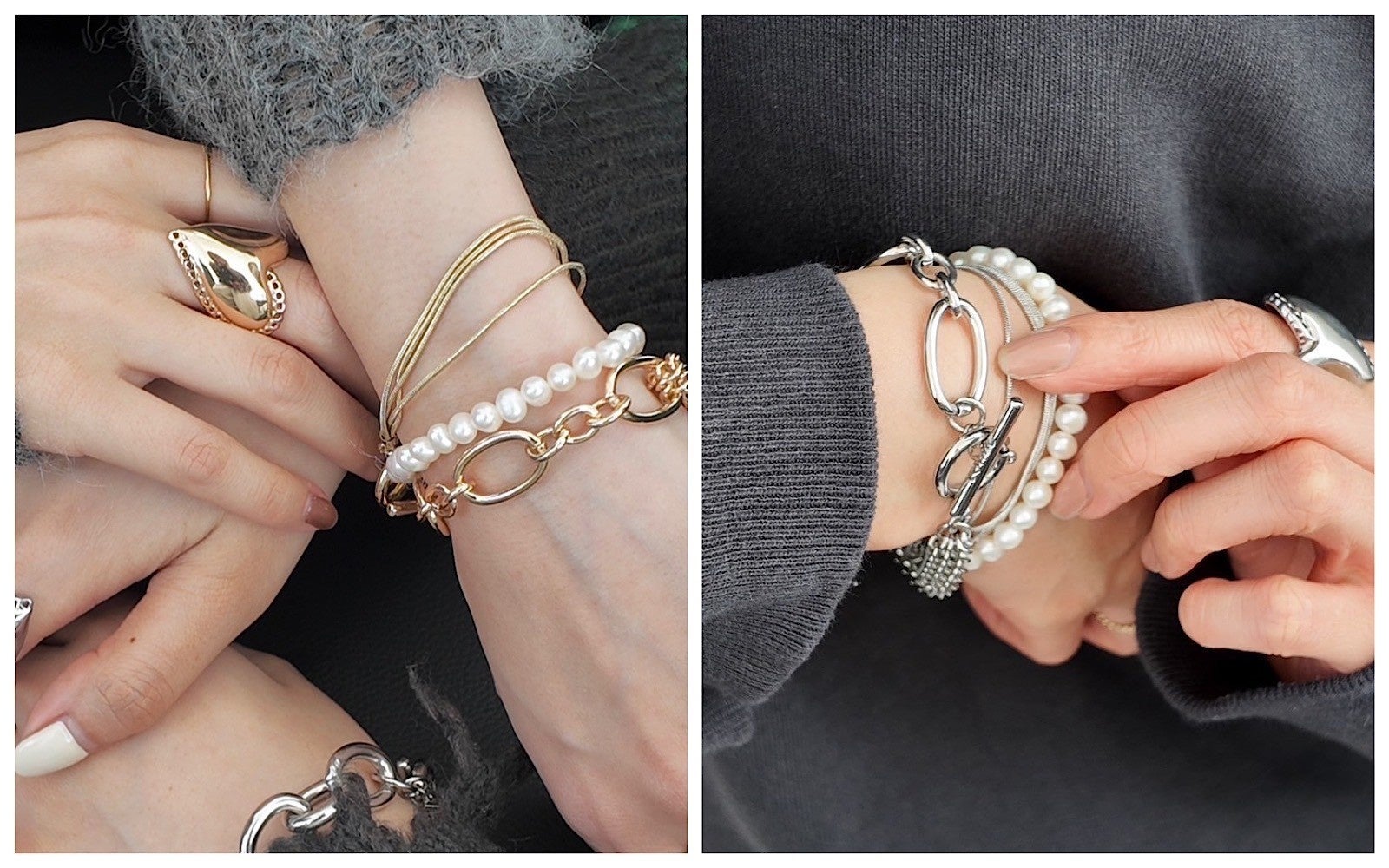 こなれ感を醸し出す3種のチェーンと、上品な淡水パールとのミックススタイルがコーディネートを格上げ。華奢な手元を演出するボリューム感もポイントです。