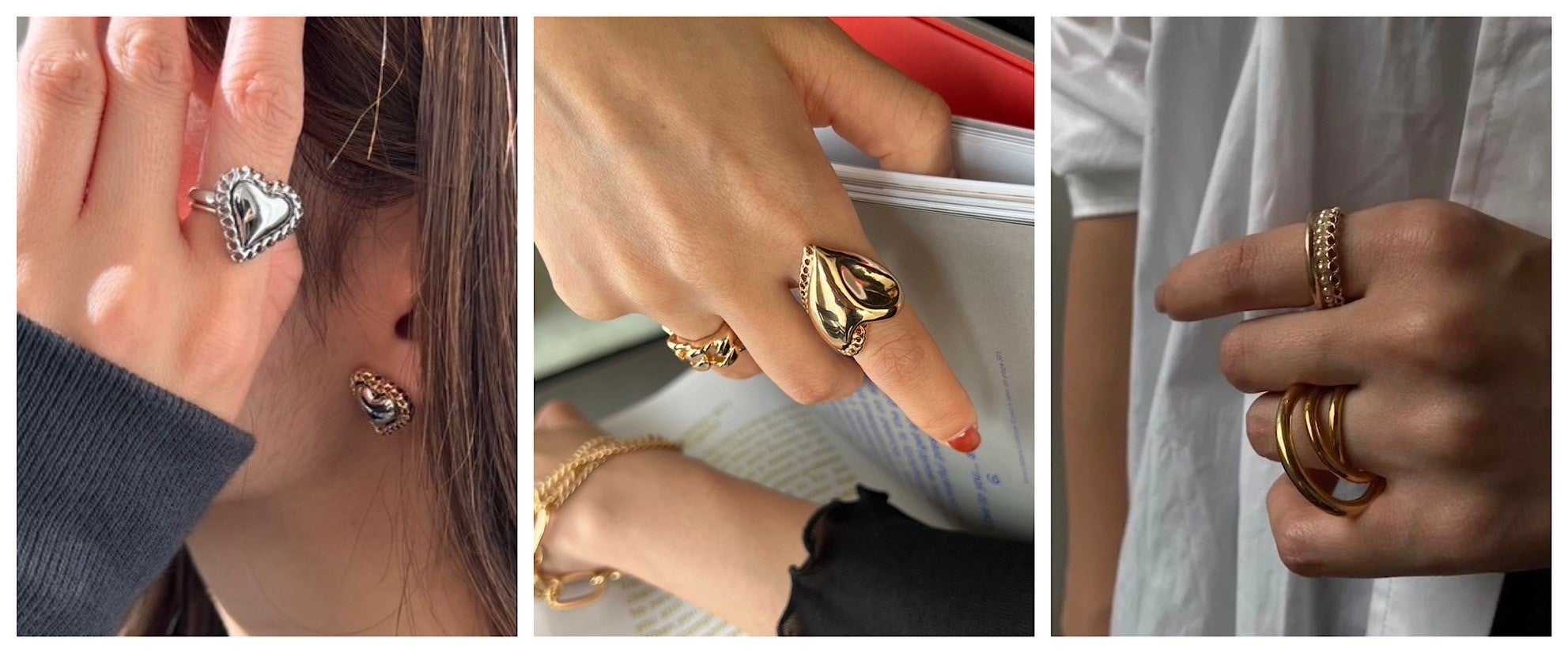 (画像左から)STUDIOUS限定でGOLDとSILVERを展開する「Heart Chain Ring」、凹凸感がありカジュアルにハートを身に付けることができる「Big Heart Chain Ring」、唯一無二のユニークな立体デザインがスタイリングにひとクセ加える「Three Overlapping Ring」を含む全4型をセレクト。