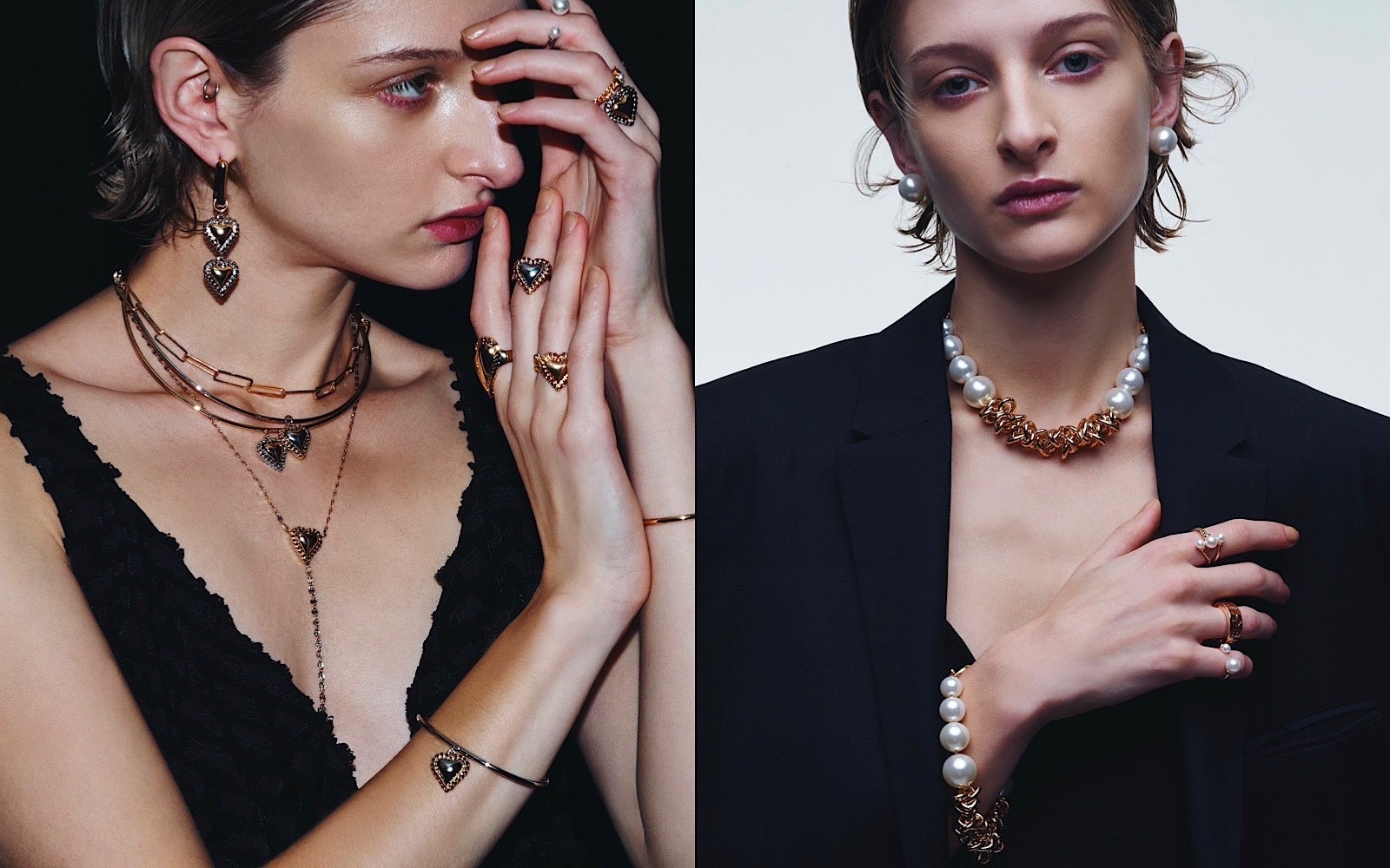 別注アイテムはネックレスとブレスレットの2型。芯の強さ、そして気品を感じるLOHMEらしいテイストを、STUDIOUSのトレンド感あふれるエッジィな世界観に落とし込み制作しました。ホリデーシーズンのギフトにもぴったりなハートモチーフやパールを施した、大人の可愛げを感じるデザインにご注目下さい。