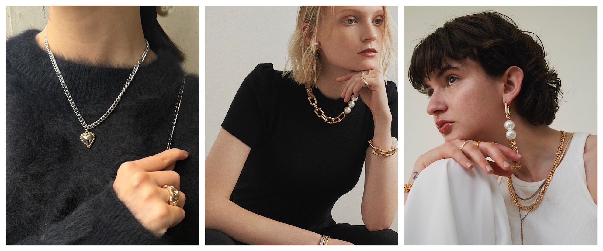 (画像左から)大人気ハートシリーズの中で、特にチェーンの存在感がありカジュアルにもクリーンにも合わせやすい「Heart Double Chain Necklace」、ホリデー気分を高める上品なパールを大ぶりなチェーンにあしらった「Pearl Mix Chain Necklace」、表情の異なる2本のチェーンがコーディネートの洗練度を高める「Two Types of Chain Necklace」を含む全8型をセレクト。