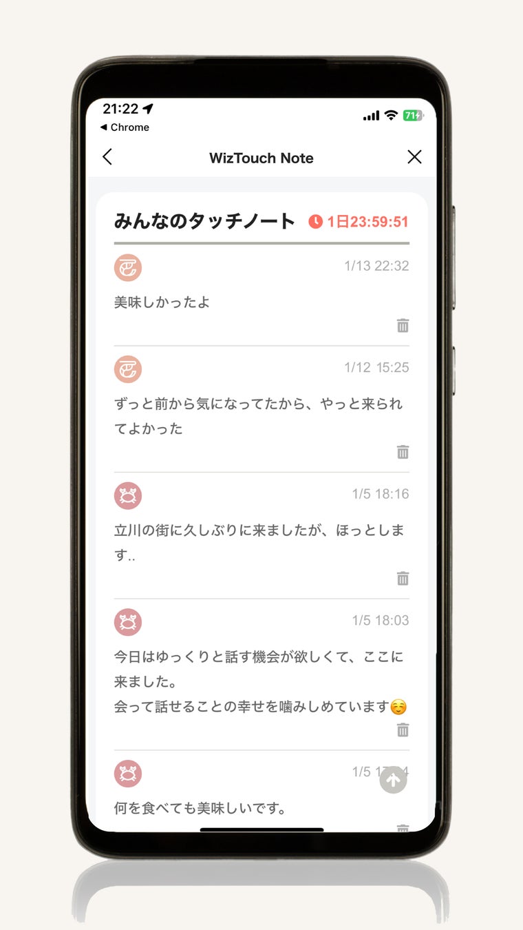 WizTouch Noteは、飲食店、ショップ、スタジアム、美術館、イベント会場など、さまざまなスポットにあるタッチノートに、今この瞬間のキモチを書き残すためのサービスです。書き込みや閲覧ができるのは、その場所を訪れた人だけ。その瞬間のキモチを大切にして、同じ場所を訪れた人だから共感できる、街のノートをコンセプトにしています。