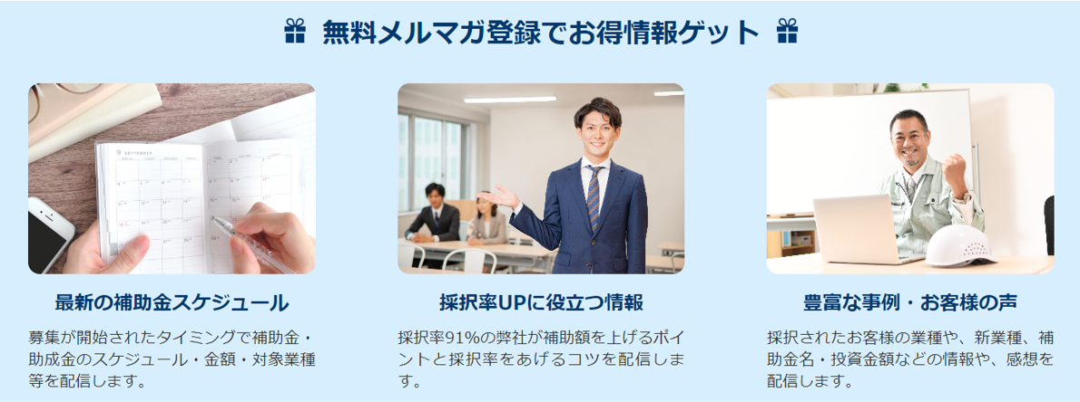 このメールマガジンに登録することで、補助金情報の見逃しがなくなり、中小企業の成長と発展を支えるための貴重な資金調達情報をタイムリーに獲得することができます。