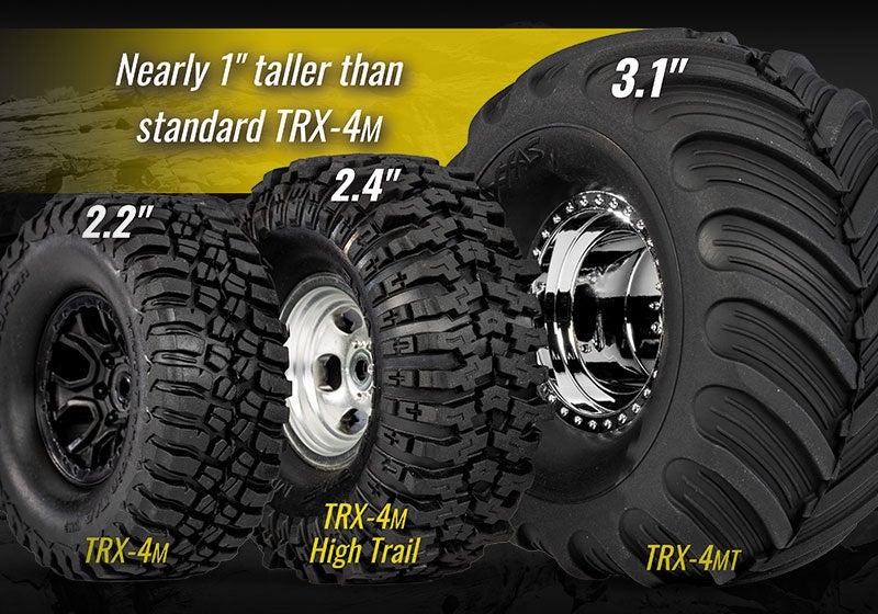 巨大なテラグルーブタイヤは、TRX-4MTにフルサイズのモンスタートラックの本物の「手彫り」の外観を再現。ビードロックトリムを備えたクロムディープディッシュホイールに取り付けられたTerra Grooveタイヤは、緩い路面に食い込むアグレッシブなトレッドパターンで優れたトラクションを提供します。粘着性のあるゴムコンパウンドは、カーペット、芝生、舗道でも最適です。