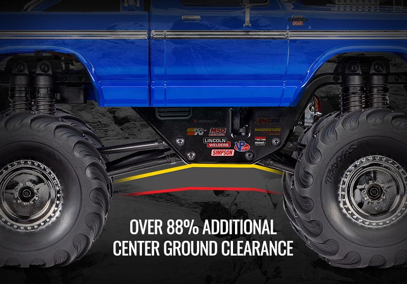 標準装着のロングアームリフトキットと大径テラグルーブタイヤによりセンター地上高を88%アップし、本格的なモンスタートラックのスタンスを実現。拡張リンクを備えた改良されたショックマウント上の8つの個別のショックにより、慎重に調整されたサスフィーリングが最高のパフォーマンスを発揮します。