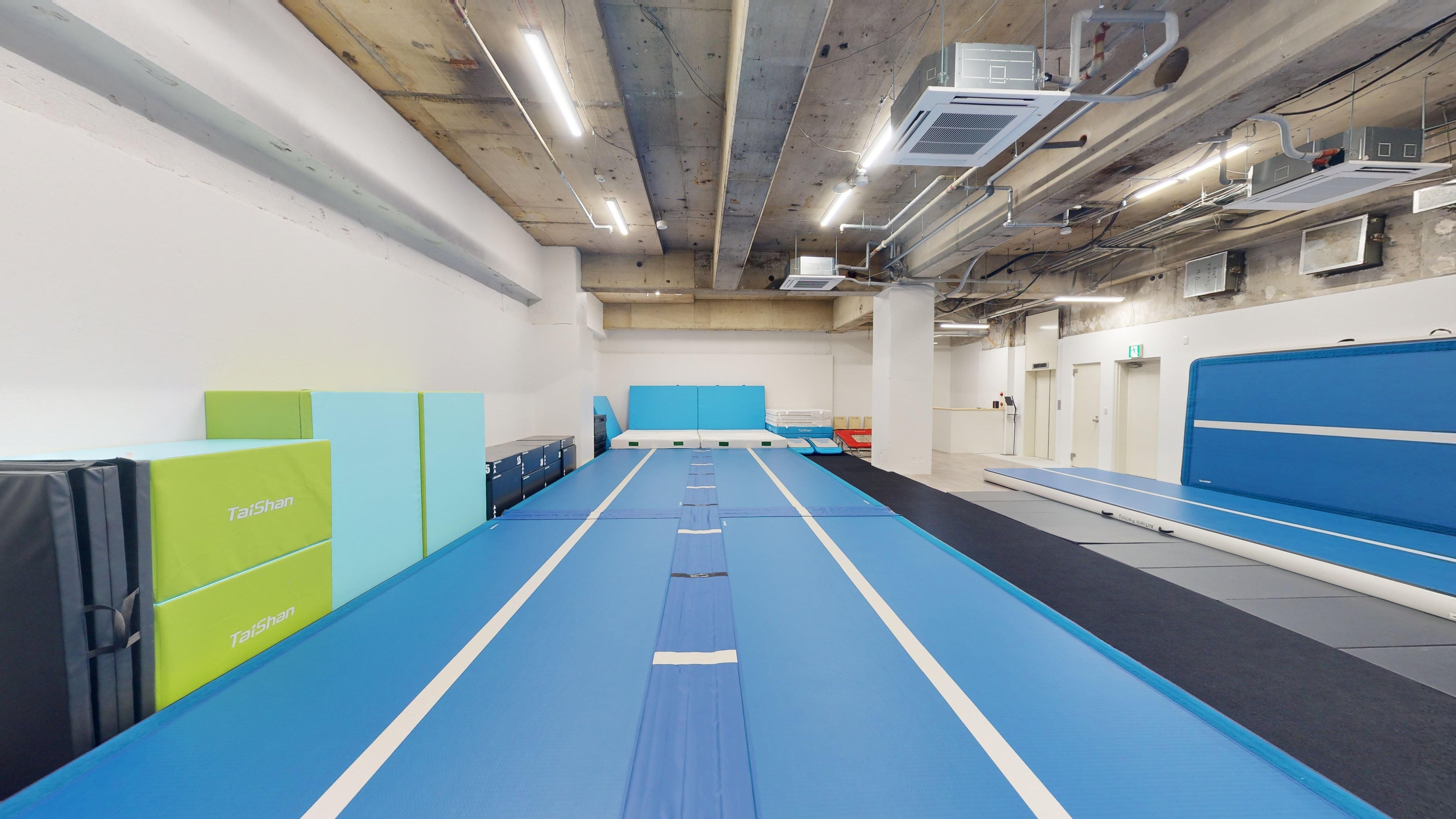『W NIHONBASHI』の大きな特徴となるのがその立地。館内で飛んだり跳ねたりするバク転教室やパルクール教室は床面積の広さや天井高が求められるため、どうしても郊外型の店舗になりがちです。しかし、新店は最寄駅の茅場町からは徒歩3分、JR東京駅からも徒歩圏内という抜群の好立地。会社帰りのビジネスマン〜学生さんまで、どなたでも通いやすい環境となっております。さらに、店内は約200平米と充分な運動スペースを確保。バク転やパルクールを始めたばかりという初心者の方だけでなく、高難度な技を練習している中・上級者にも対応しています。