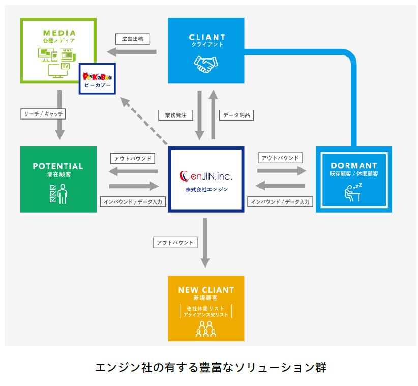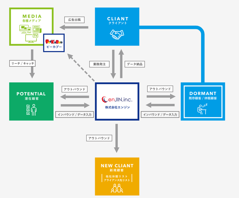 アウトバウンド型(発信型)企業は、主に通信事業など商品を絞って業務を行なっている企業が多く見られます。その一方で、エンジン社は多種多様なクライアント群を有しており、それは同時に様々な業界の知識をもっているメンバー/スタッフが在籍していることを示唆しています。つまり、それがそのまま企業としての様々な人やナレッジ、CXやNPSに関するノウハウを有していることに他なりません。