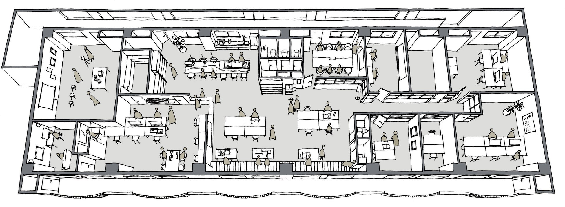 4Fはコワーキングスペースやレンタルオフィス、撮影スタジオなどが整備されたワークスペースです。アウトクロップの新オフィスもこちらに移転し、利用者の皆さんと同じ空間で日々の業務に取り組みます。フロア全体で高速のWi-Fiが利用可能です。
