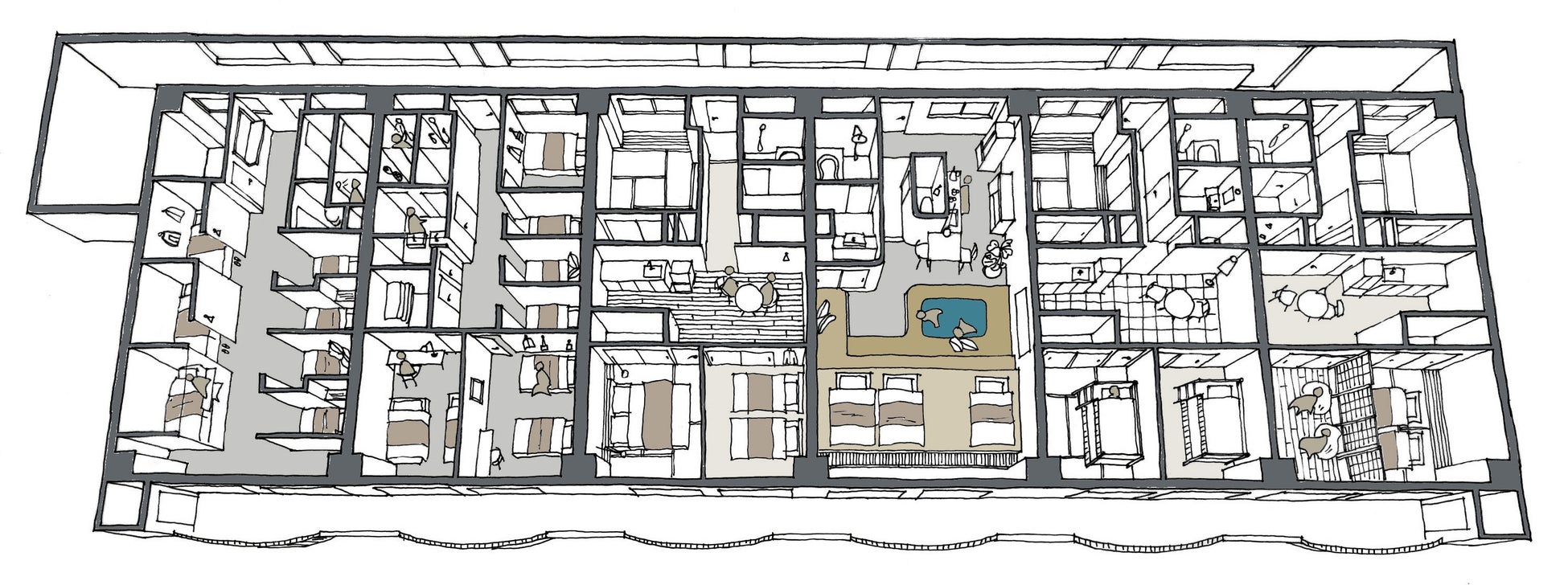 2Fは短期滞在向けのホステルやコンセプトルーム、中長期滞在用のレジデンス設備を含んだ宿泊エリアです。DELTAに宿泊施設を作るのは、4Fのワークスペースを利用するみなさんにゆったりとした気分で滞在してほしいと思ったこと。加えて、バックパッカーをはじめとする海外からの旅行者の人に利用してもらいたいという考えからです。
