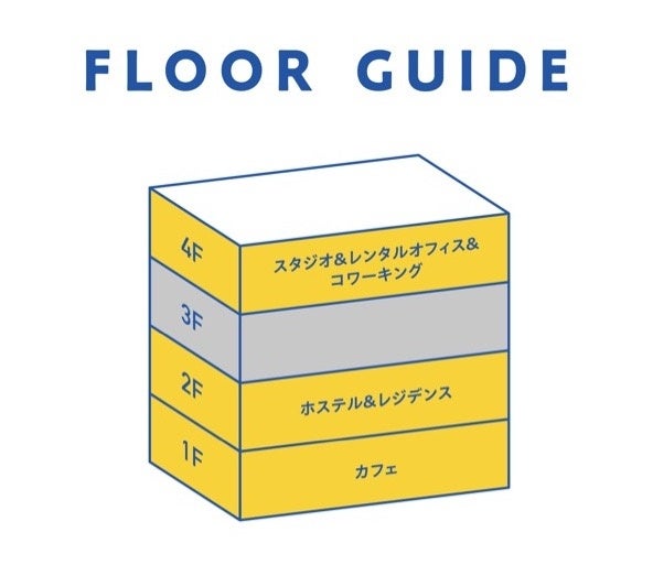 1Fは地域の方々も気軽にコーヒーや軽食を楽しめるカフェ。そして2Fは短期〜長期で利用可能なホステル・レジデンス機能を持つ宿泊施設。最上階である4Fはレンタルオフィスやコワーキングスペース、撮影スタジオなどの機能を整備したワークスペースです。