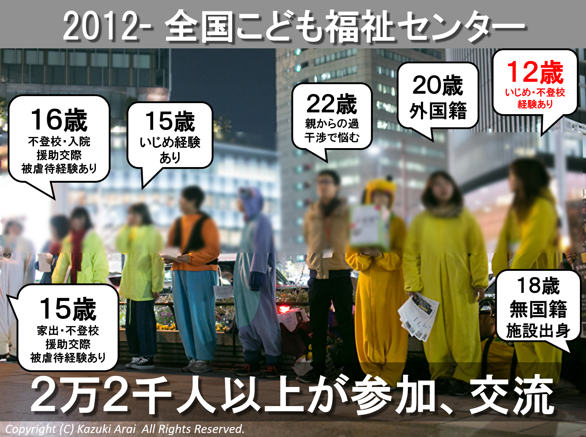 今年は「こども基本法」の施行、こども家庭庁の創設などが始まったこども政策元年といえる年です。全てのこども若者が、健やかに成長することができ、ひとしく権利が保障され、各々が幸せを追求できる社会を目指していくためには、学校や児童福祉施設中心の取り組みだけでは不十分です。元児童養護施設児童指導員だった荒井和樹は、全国こども福祉センタを2012年7月に設立し、「ともに交流の拠点を築き、たがいの理解を深め、各々の福祉や課題を追求する」を理念に街中で声かけ活動を始めました。こども若者がアクセスしやすい街中に交流の拠点を築くことで、のべ2万人以上に活動や交流機会を提供しています。