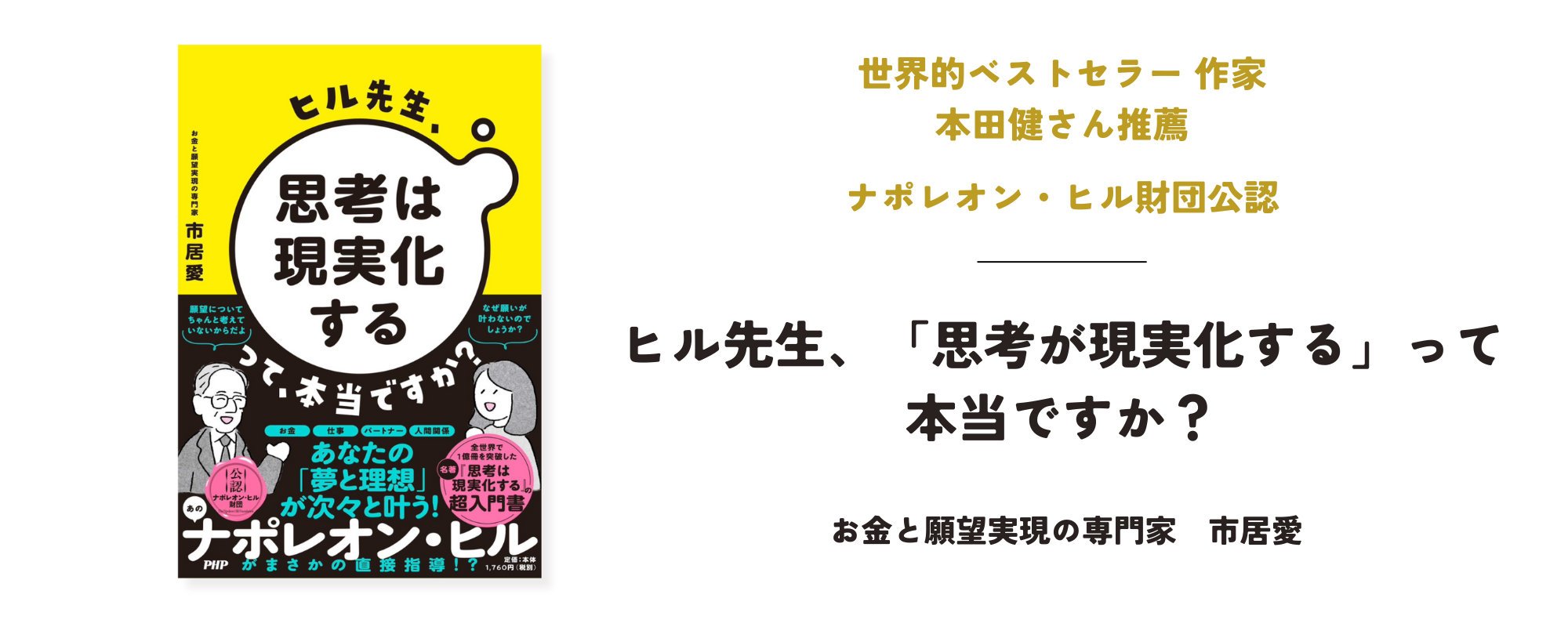 今回、新刊『ヒル先生、「思考は現実化する」って本当ですか?』の出版を記念し、実際に著者である市居愛と「思考は現実化する」を監訳した田中孝顕氏との対談動画をお申込みいただいた全ての方に全編動画を無料でプレゼントします。