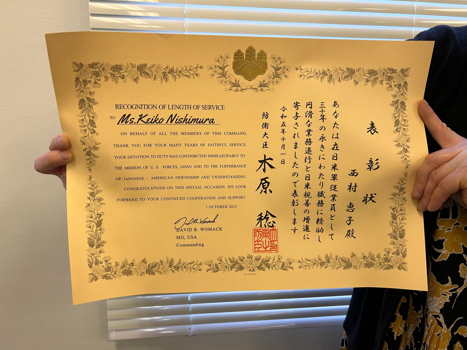 西村恵子氏は、在日米軍での長いキャリアの中で、卓越なリーダーシップと優れた専門知識を発揮し、日本とアメリカの友好関係の強化に貢献してきました。彼女の専念と奉仕の精神は、地域社会においても高い評価を受けており、今回の表彰はその一環として贈られました。