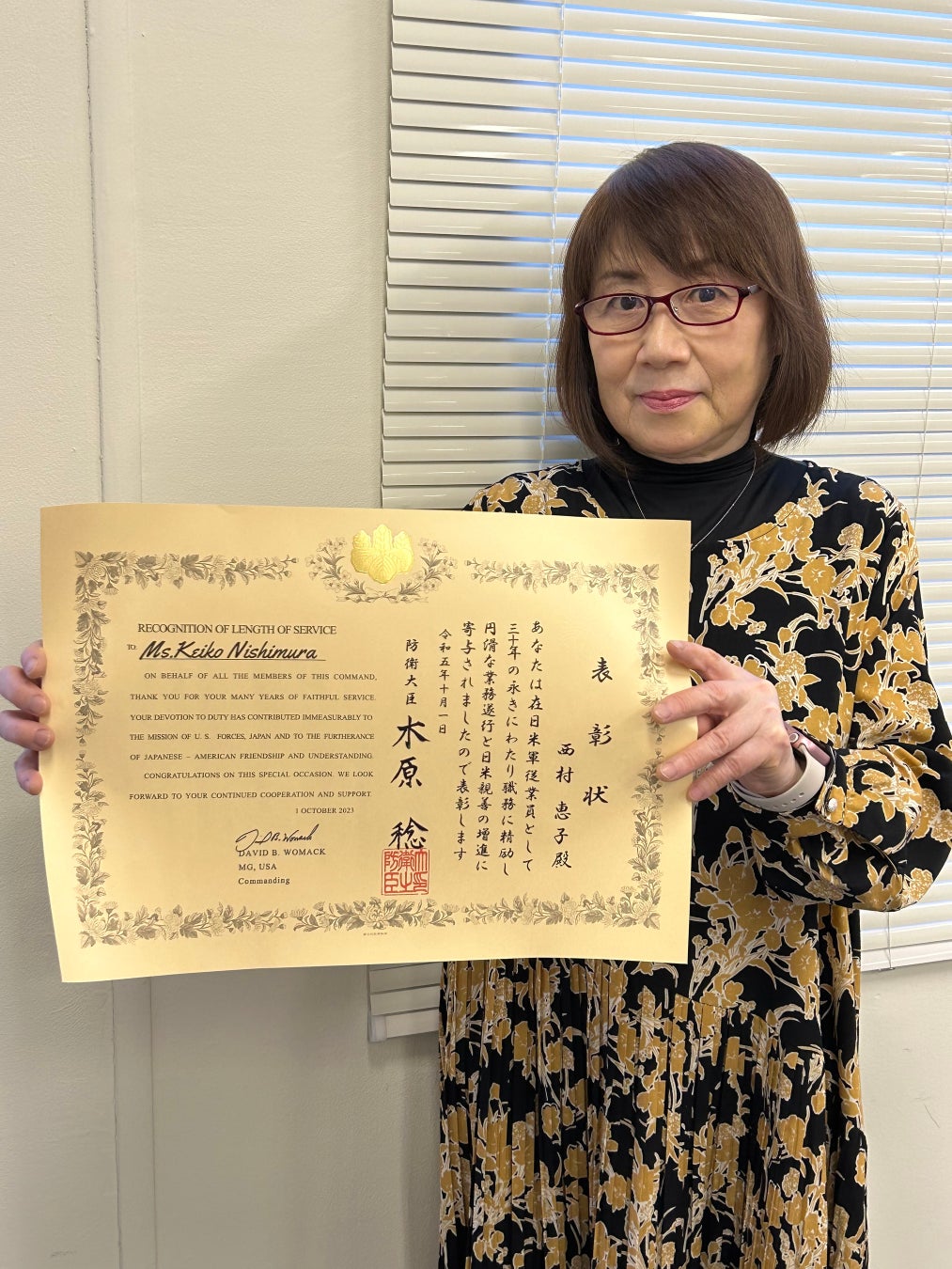 株式会社BRIDGEHEAD 所属 西村恵子、在日米軍勤続30年を讃えられ 木原防衛大臣から表彰