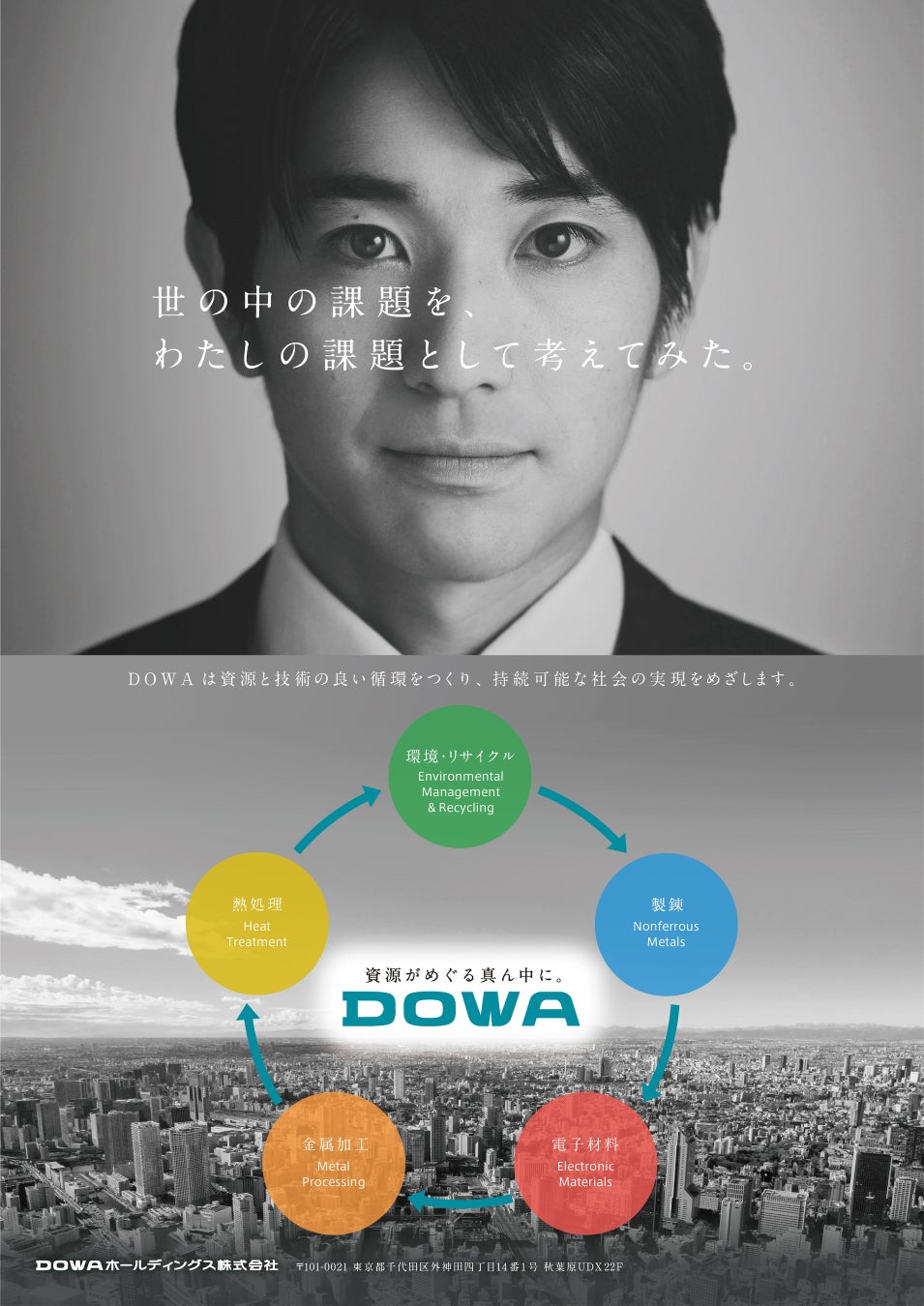 DOWAホールディングス株式会社(東京都千代田区外神田四丁目14番1号 資本金:364 億円 社長:関口 明)は、当社グループの企業理念やビジョン(2030年のありたい姿)の実現に向けた姿勢を明確化し、ステークホルダーのみなさまに当社グループをより身近に感じていただくことを目的として、タグライン※「資源がめぐる真ん中に。」を策定するとともに、広告デザインを刷新しました。なお、タグラインの策定は、当社の創業以来、初めてとなります。