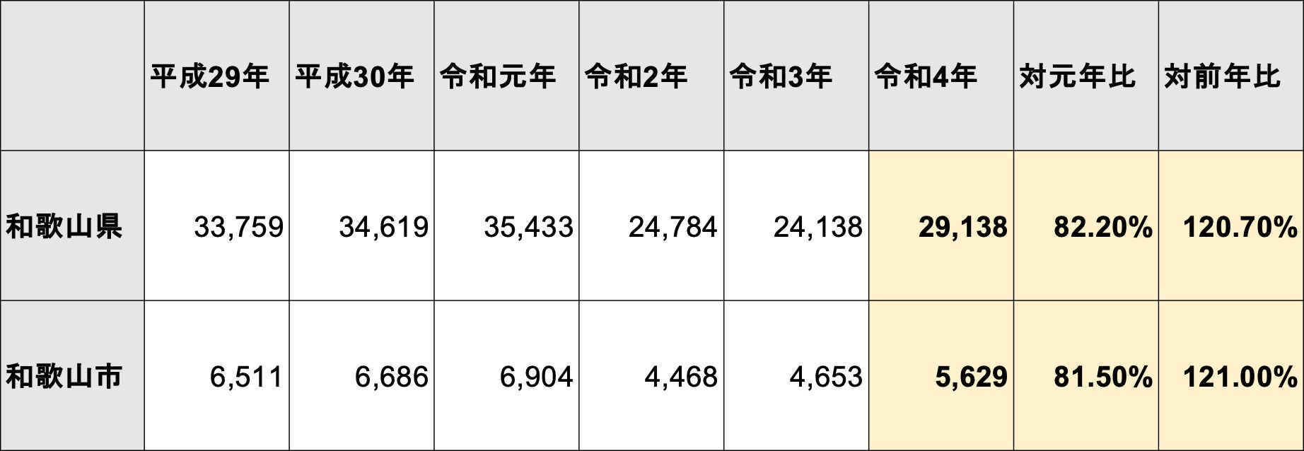 「令和4年観光動態調査」によると和歌山県は令和元年に過去最高の観光入込客数を達成したものの、コロナ禍により大きく減少しました。令和4年は昨対比で取り戻してきてはいるものの、コロナ前の数値には戻っていません。