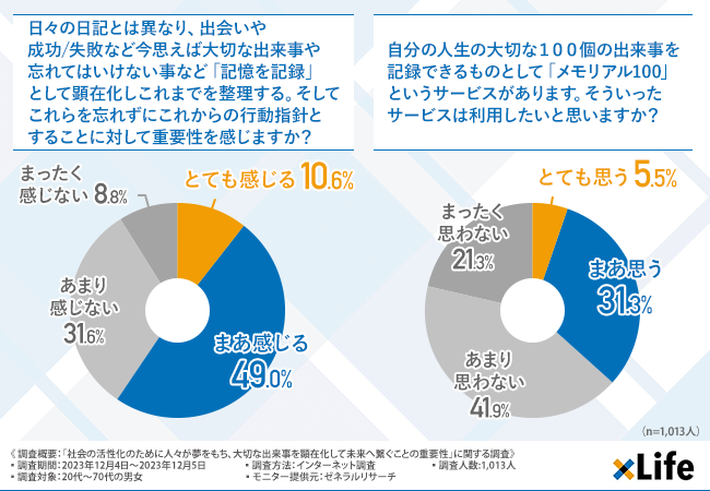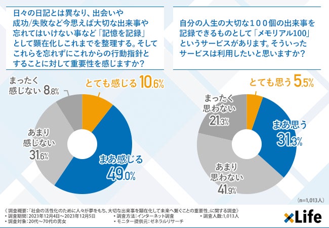 「日々の日記とは異なり、出会いや成功/失敗など今思えば大切な出来事や忘れてはいけない事など「記憶を記録」として顕在化しこれまでを整理する。そしてこれらを忘れずにこれからの行動指針とすることに対して重要性を感じますか?」と質問したところ、『とても感じる(10.6%)』『まあ感じる(49.0%)』という回答結果になりました。