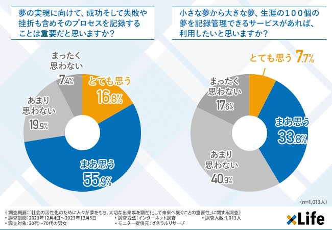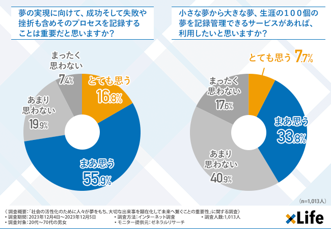 「小さな夢から大きな夢、生涯の100個の夢を記録管理できるサービスがあれば、利用したいと思いますか?」と質問したところ、『とても思う(7.7%)』『まあ思う(33.8%)』という回答結果になりました。
