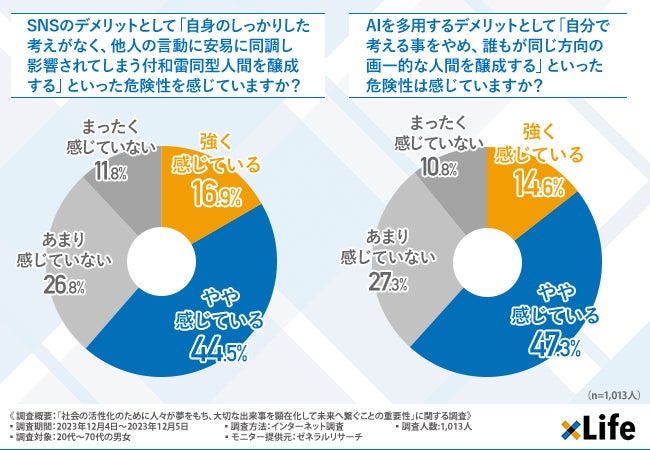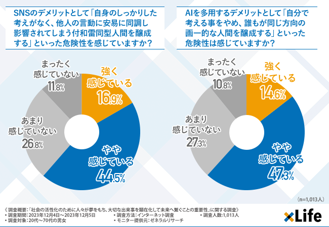 「AIを多用するデメリットとして「自分で考える事をやめ、誰もが同じ方向の画一的な人間を醸成する」といった危険性は感じていますか?」と質問したところ、『強く感じている(14.6%)』『やや感じている(47.3%)』という回答結果になりました。