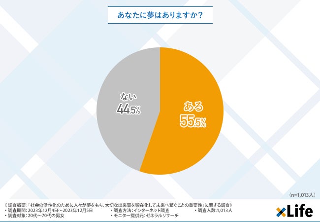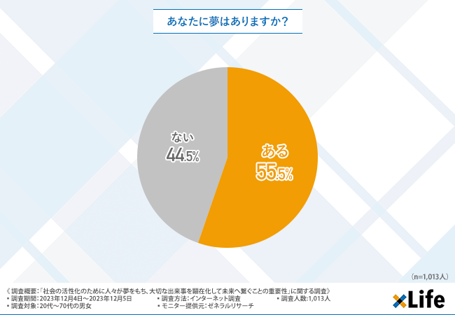 「あなたに夢はありますか?」と質問したところ、半数以上の方が『ある(55.5%)』と回答しました。