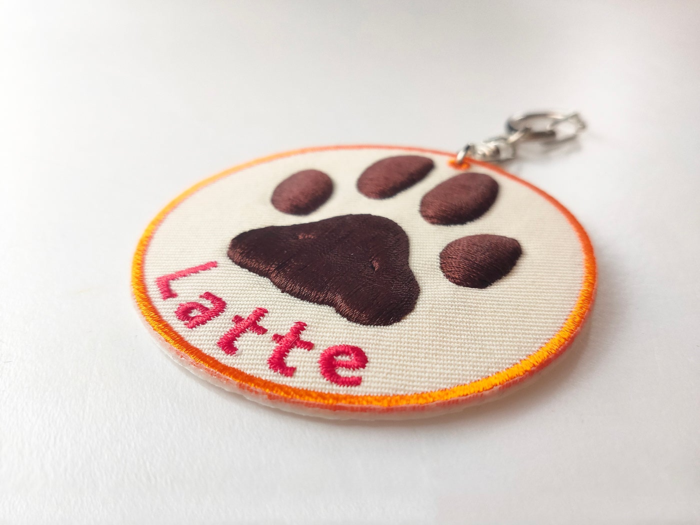 ワッペンやキーホルダーのデザインは、生地の色(8色)、フチの糸色(10色)、肉球の糸色(30色)、お名前の糸色(30色)、お名前の表記について、お選びいただけます。