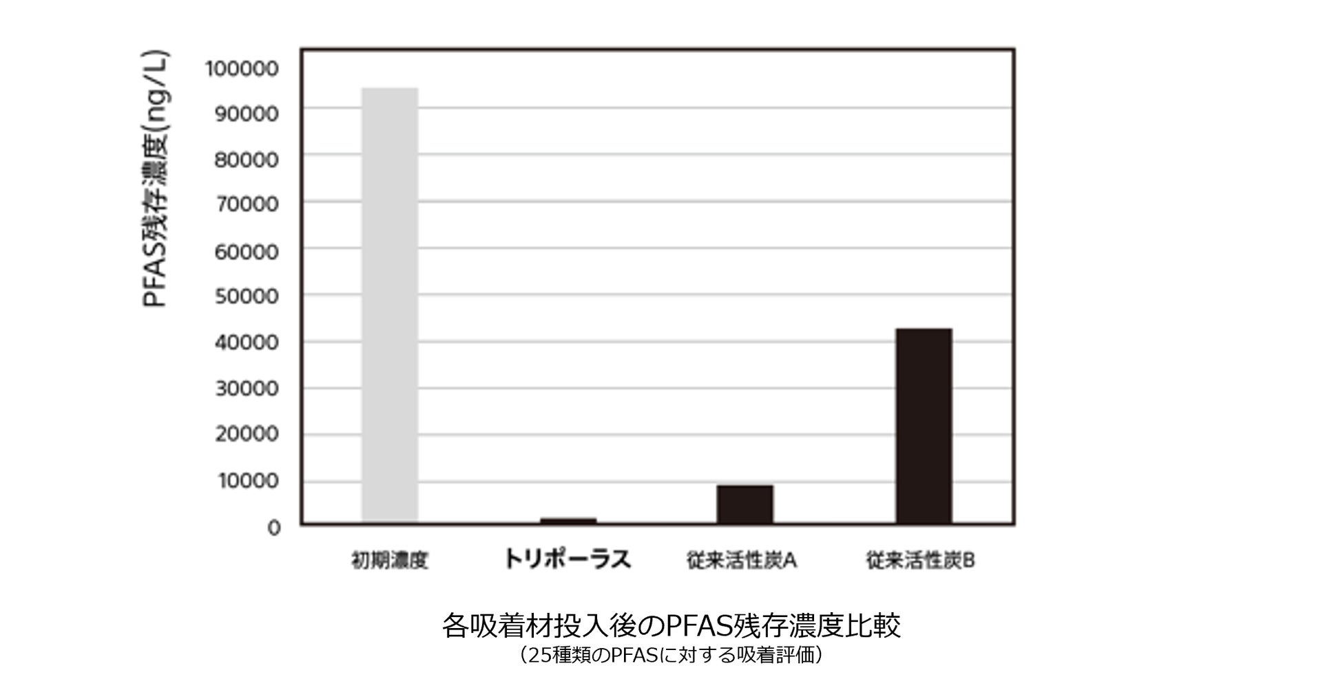 ISO21675※の手法による調査で、Triporousは従来活性炭と比較して多様な種類のPFAS(有機フッ素化合物)を効果的に吸着できることが確認されており、水や土壌の環境修復への活用が期待されています。