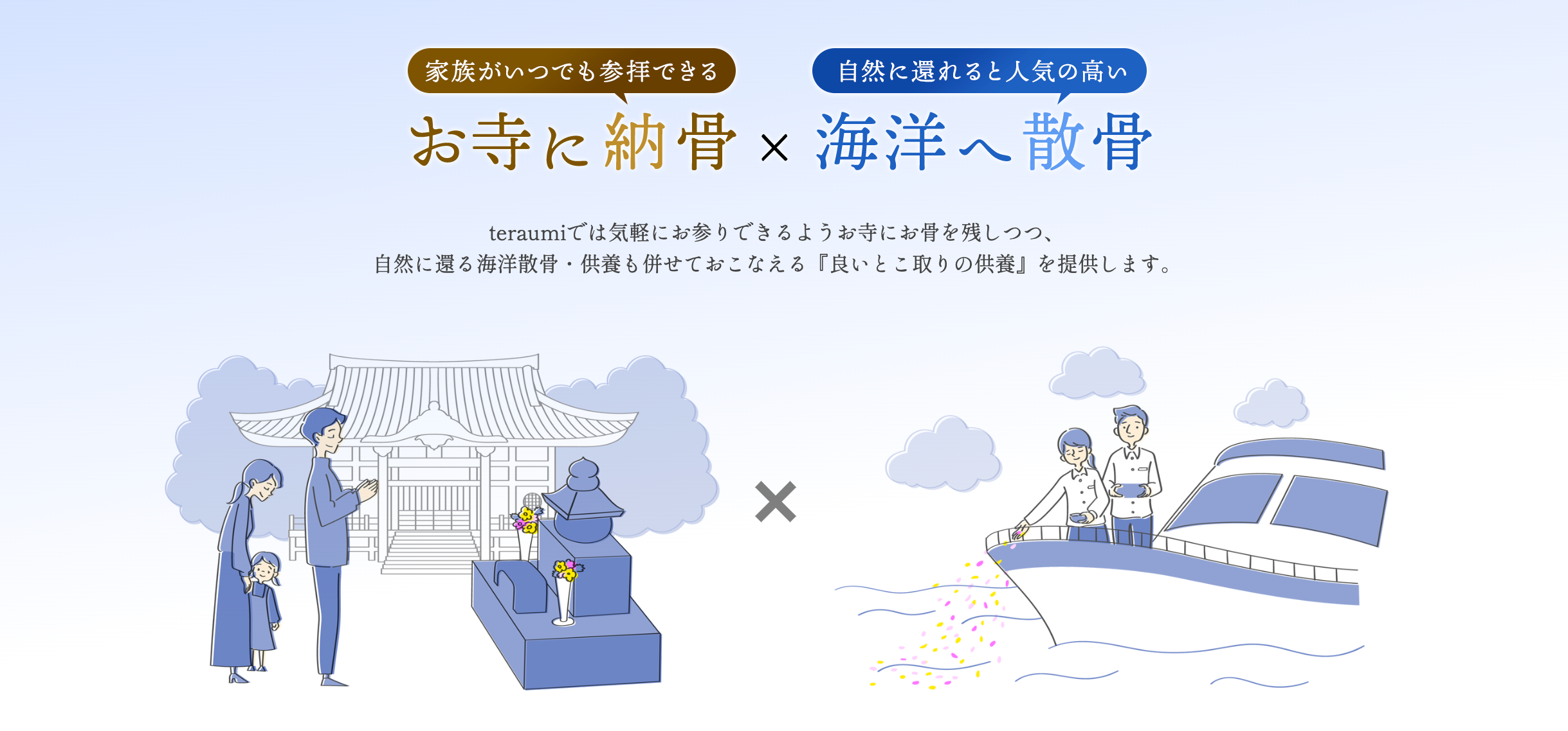そこで、海洋散骨をしつつも、一部はお寺に納骨することで心の負担が軽減されることを願い、『teraumi(てらうみ)』というご供養サービスを新しく展開することとなりました。