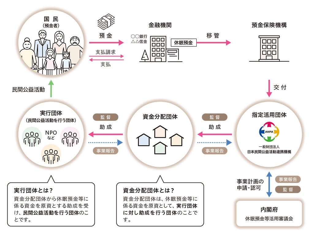 休眠預金等活用とは、「民間公益活動を促進するための休眠預金等に係る資金の活用に関する法律」(休眠預金等活用法)に基づき、2009年1月1日以降の取引から10年以上、その後の取引のない預金等(休眠預金等)を社会課題の解決や民間公益活動の促進のために活用するものです。JANPIAが資金分配団体を公募・選定し、採択された資金分配団体は選定された事業計画を元に、民間公益活動を行う実行団体を公募・選定し、資金的及び非資金的支援を伴走型で提供します。<休眠預金の流れ(JANPIA ウェブサイトより)>