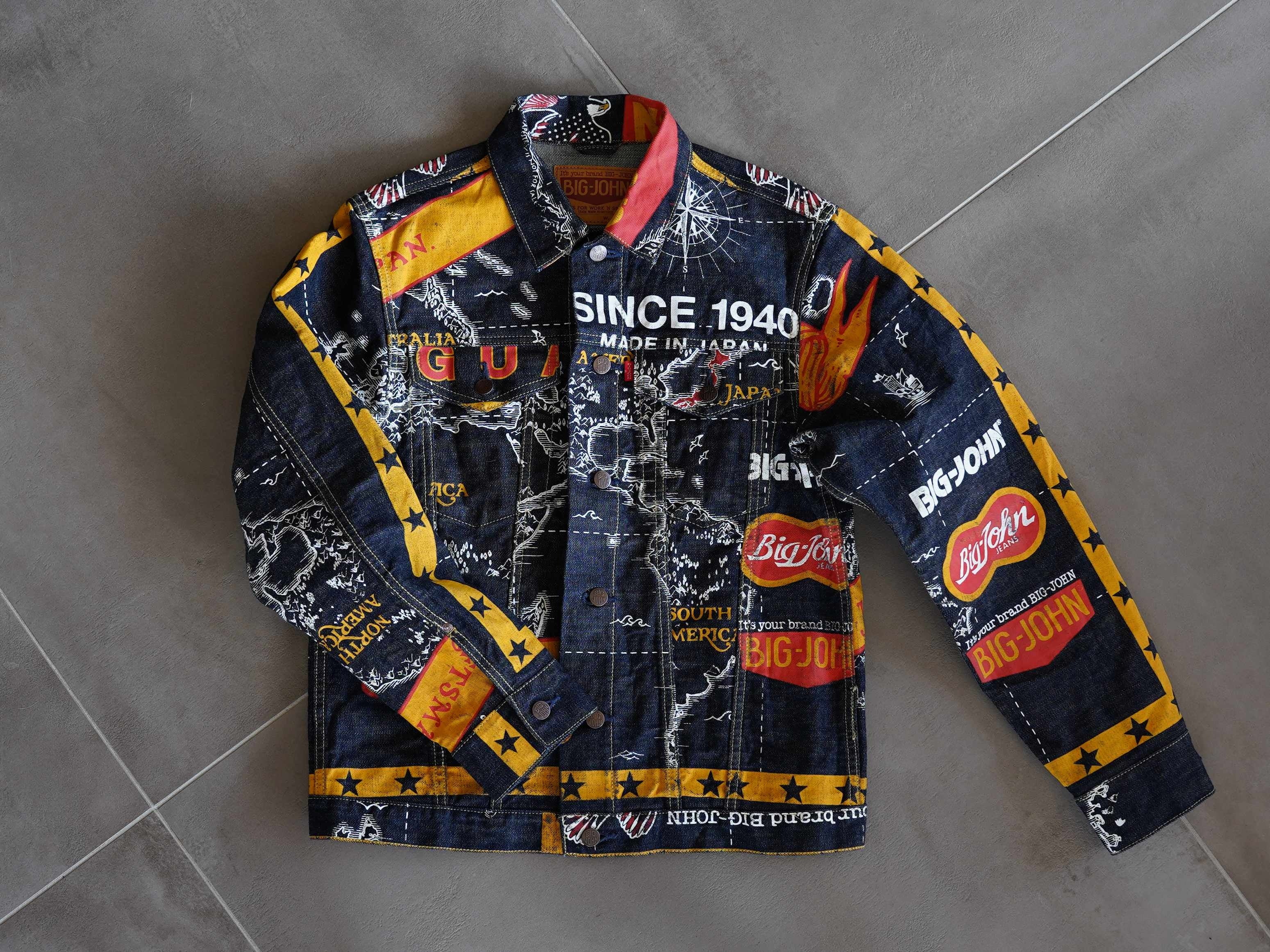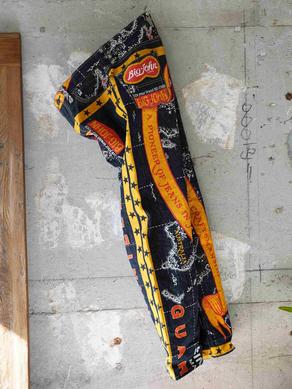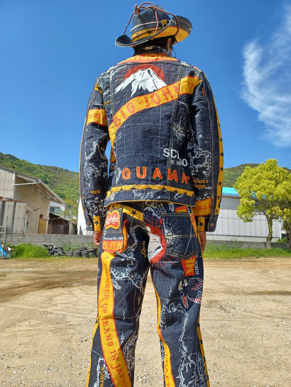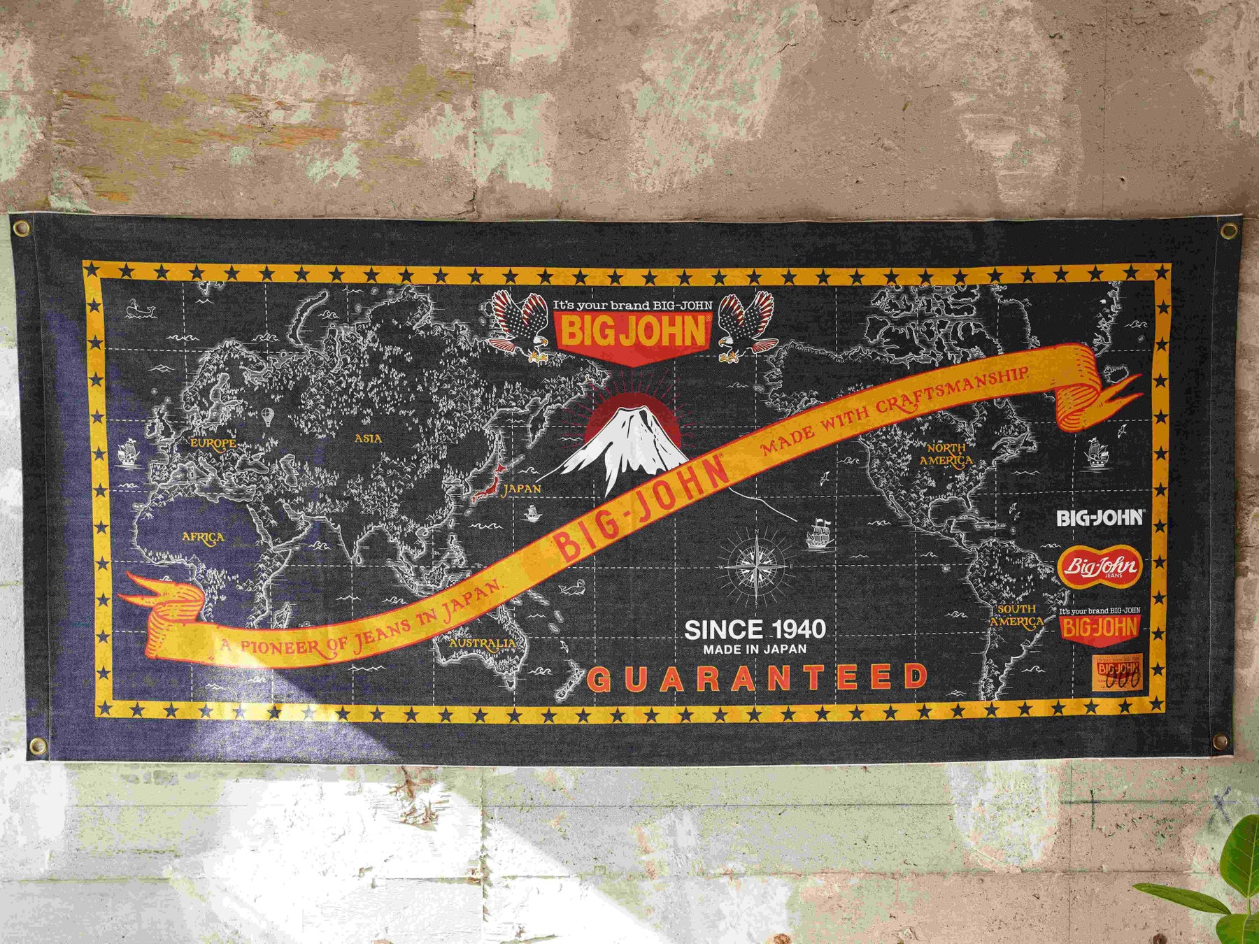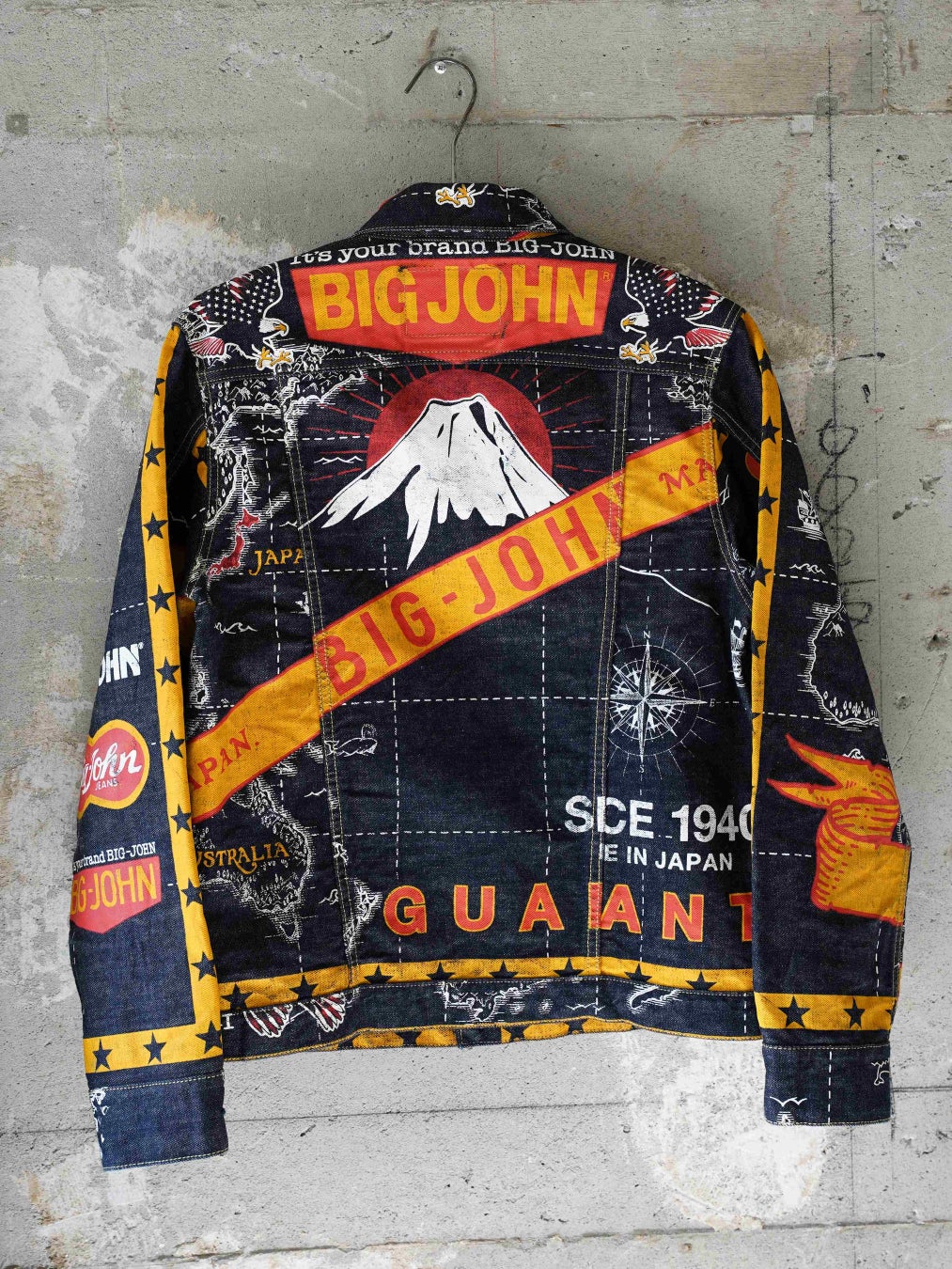 生地にはKURABOU 14OZ SELVAGE DENIMを使用。手刷りによるプリントを京都の手捺染工場にて行っています。一枚一色ずつ手作業で丁寧に染められている他、どのサイズのジャケット、パンツを着用してもデザインが一番カッコよく見えるよう裁断を考慮した、きめの細かい手染め作業を行っているのが特徴です。象徴的なデザインとして、地図のようなモチーフに大きなベースボールロゴ。BIG JOHNが世界中の人々に愛されるジーンズを提供するという創業以来の普遍のテーマを表しています。