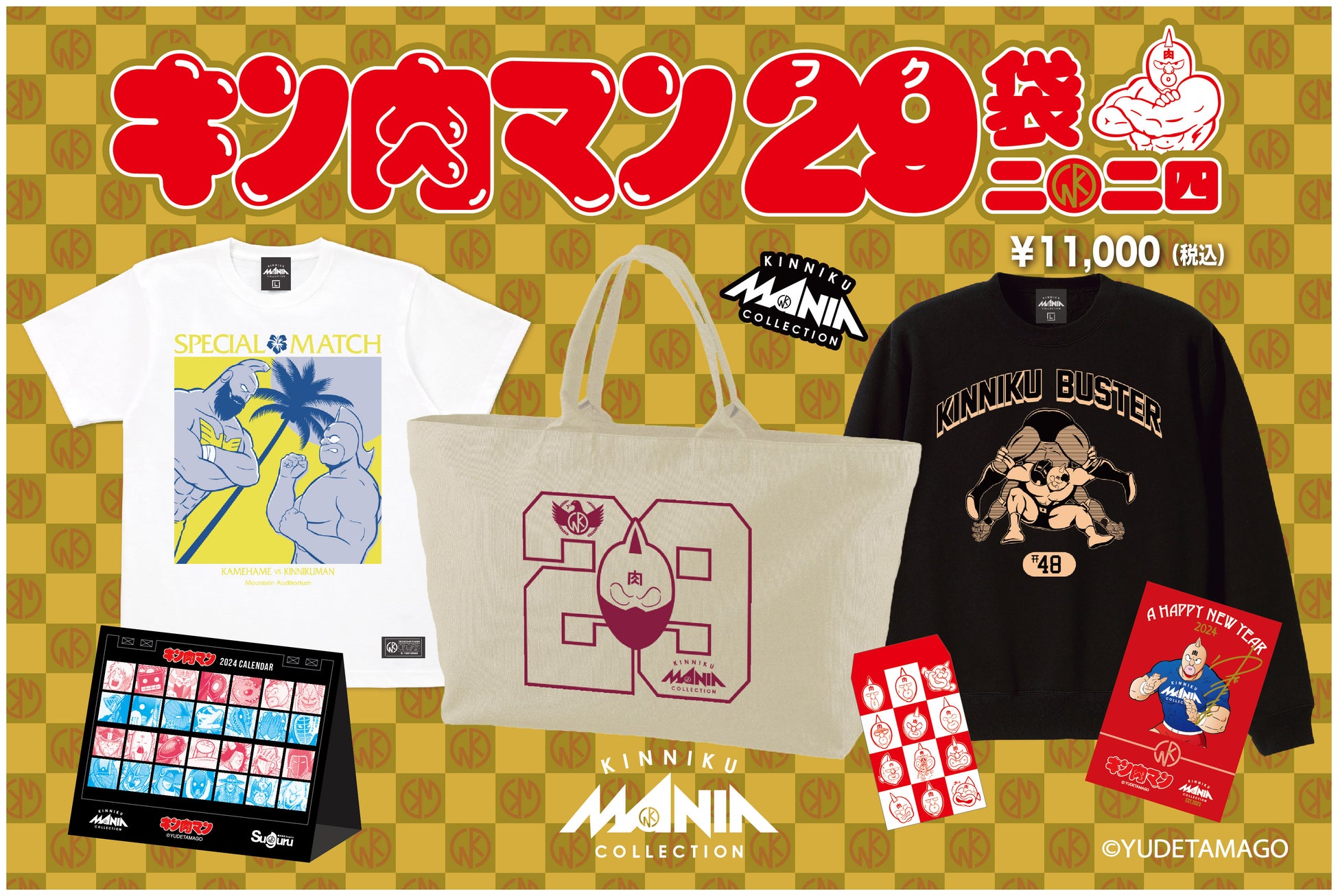 発売日には新デザインのTシャツ5種に加え、過去に発売し好評だったキン肉マンアパレルのデザイン5種も「KINNIKUMANIA ReCOLLECTION」として復活!!計10種を発売します。限定デザインのトートバッグにTシャツやスウェットなどが入ったお得な「キン肉マン29(フク)袋2024」も数量限定で発売いたします。