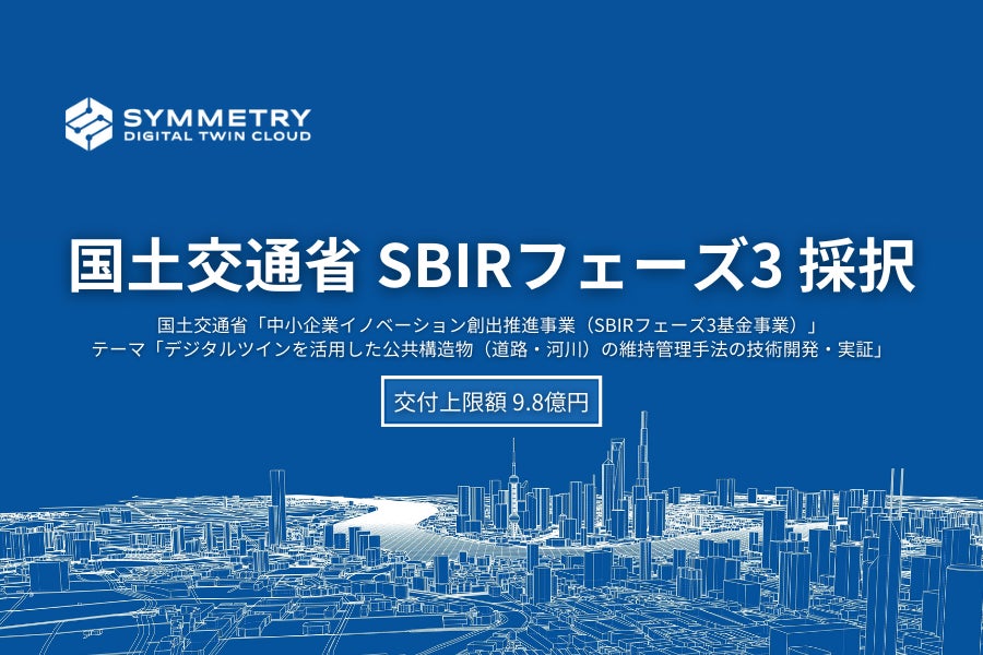 株式会社SYMMETRY(本社:東京都千代田区、代表取締役社長:有馬 浩史、以下「シンメトリー」)は、国土交通省「中小企業イノベーション創出推進事業(SBIRフェーズ3基金事業)」の「デジタルツインを活用した公共構造物(道路・河川)の維持管理手法の技術開発・実証」において、「橋梁・トンネル・道路等インフラメンテナンスのためのデジタルツイン・プラットフォームのシステム及びインフラ基盤開発・実証・商用化」を提案し、採択されました(交付額上限9.8億円)。