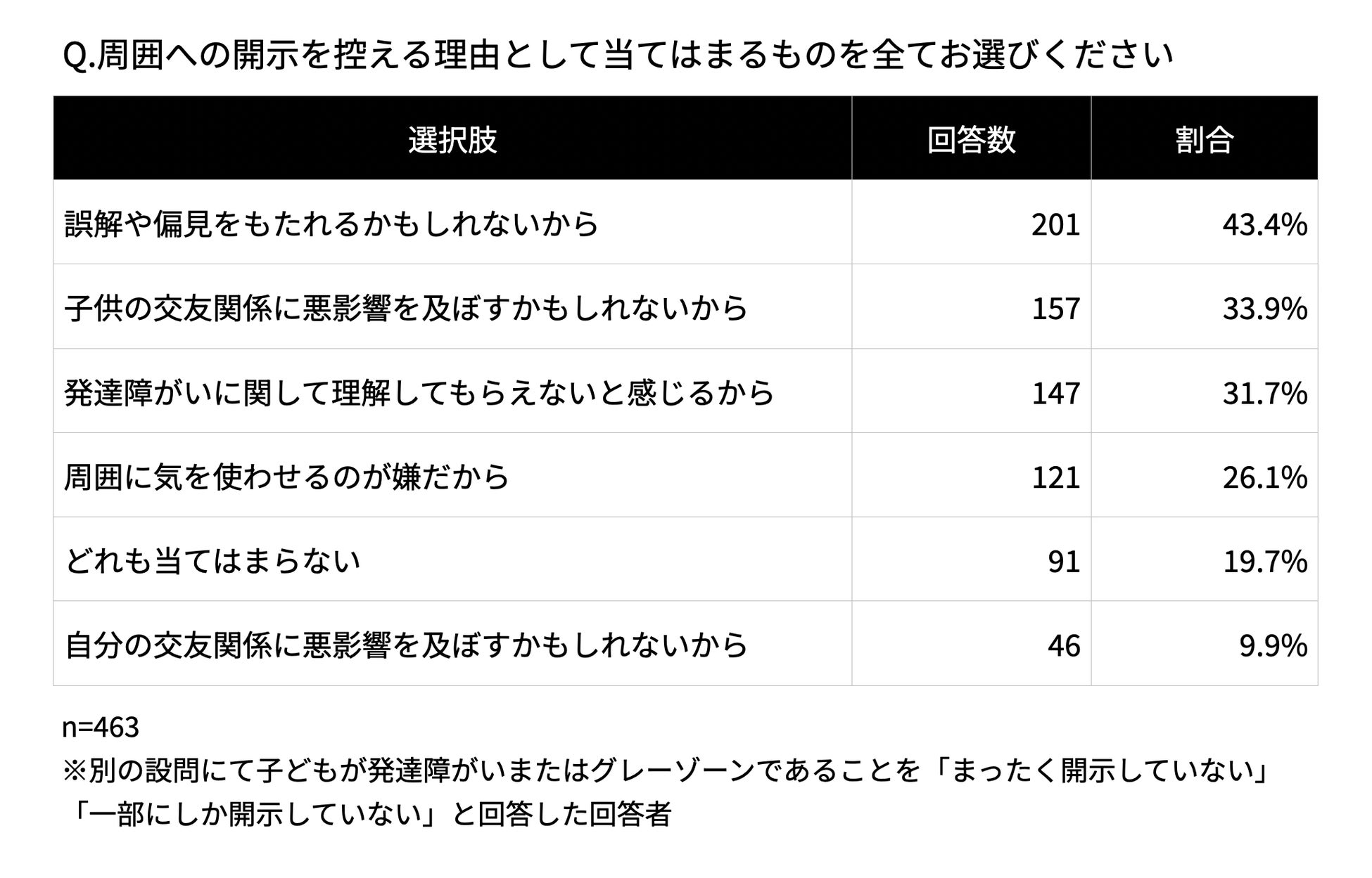「周囲への開示を控える理由として当てはまるものを全てお選びください」という設問の回答としては、「誤解や偏見を持たれる恐れがあるから(43.4%)」に次いで「子どもの交友関係に悪影響を及ぼすかもしれないから(33.9%)」が多いという結果となりました。
