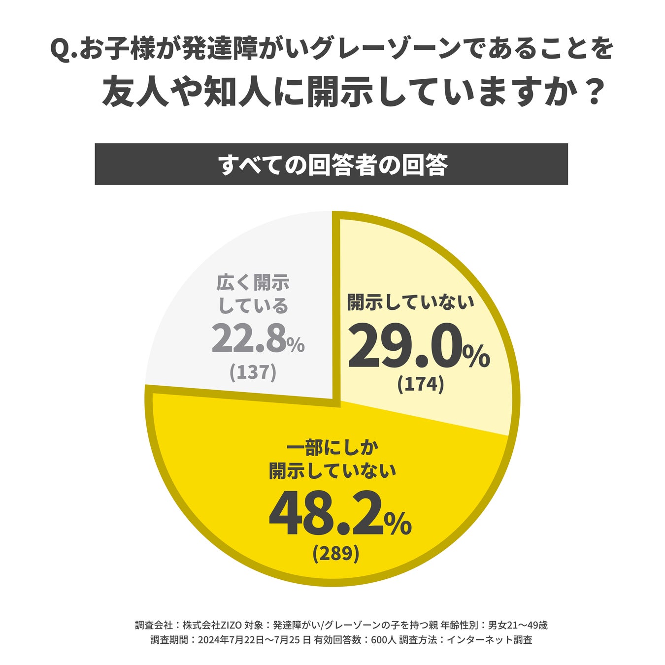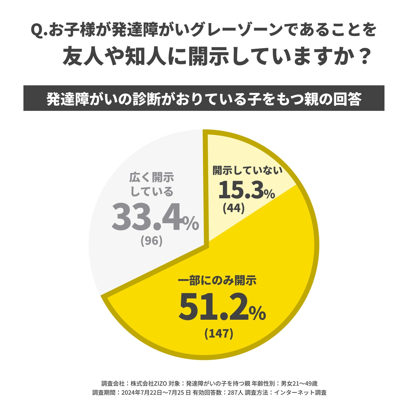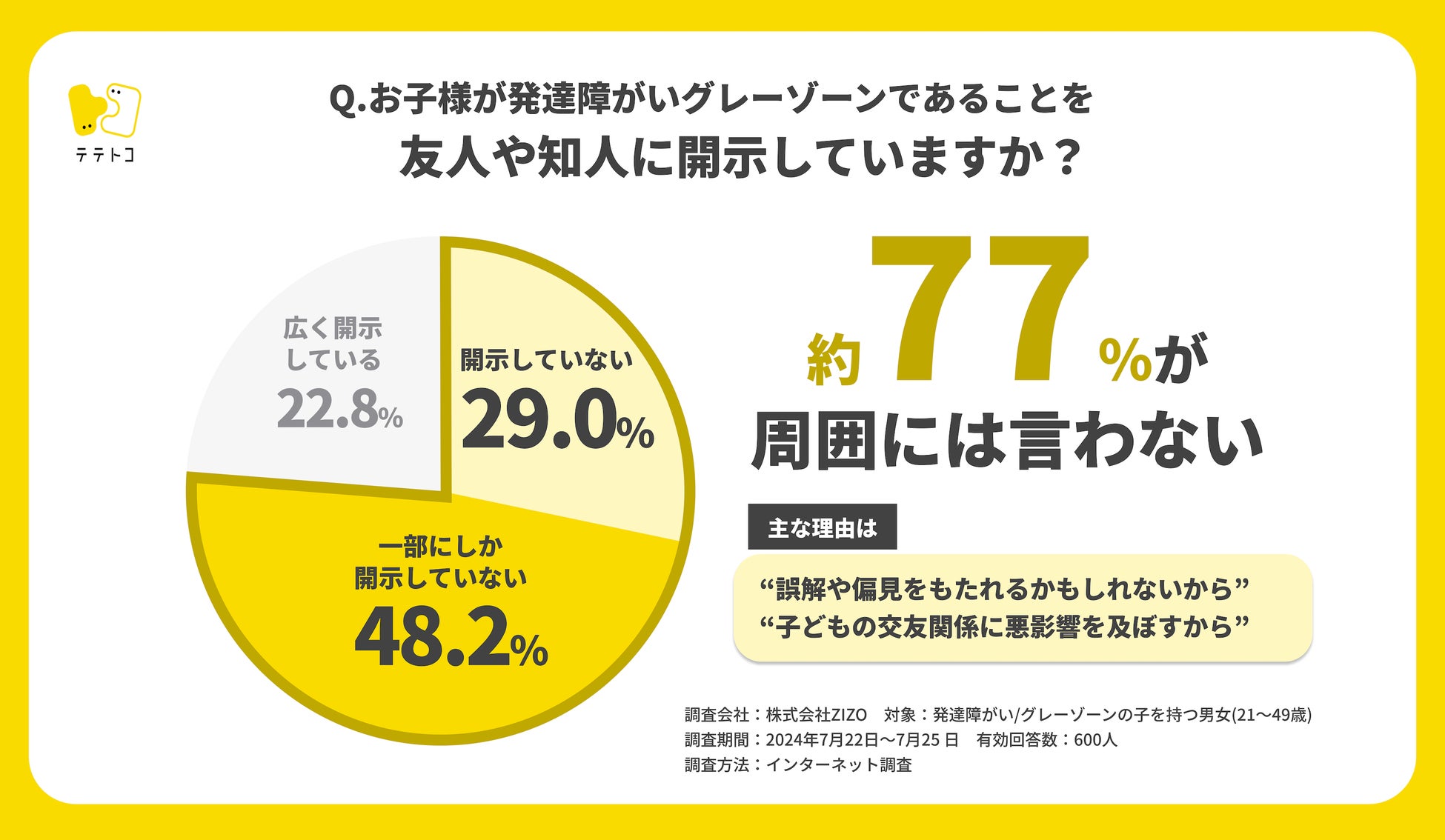発達障がい・グレーゾーンの子どもを持つ保護者向けSNS「テテトコ」を運営する株式会社ZIZO(本社:大阪府大阪市、代表:仲島 宗徳)では「子どもの発達特性の周囲への開示状況」に関する調査を実施。その結果、多くの当事者家族が、子どもの発達特性を周囲に明かすことにリスクを感じ、開示を控えながら生活していることが分かりました。