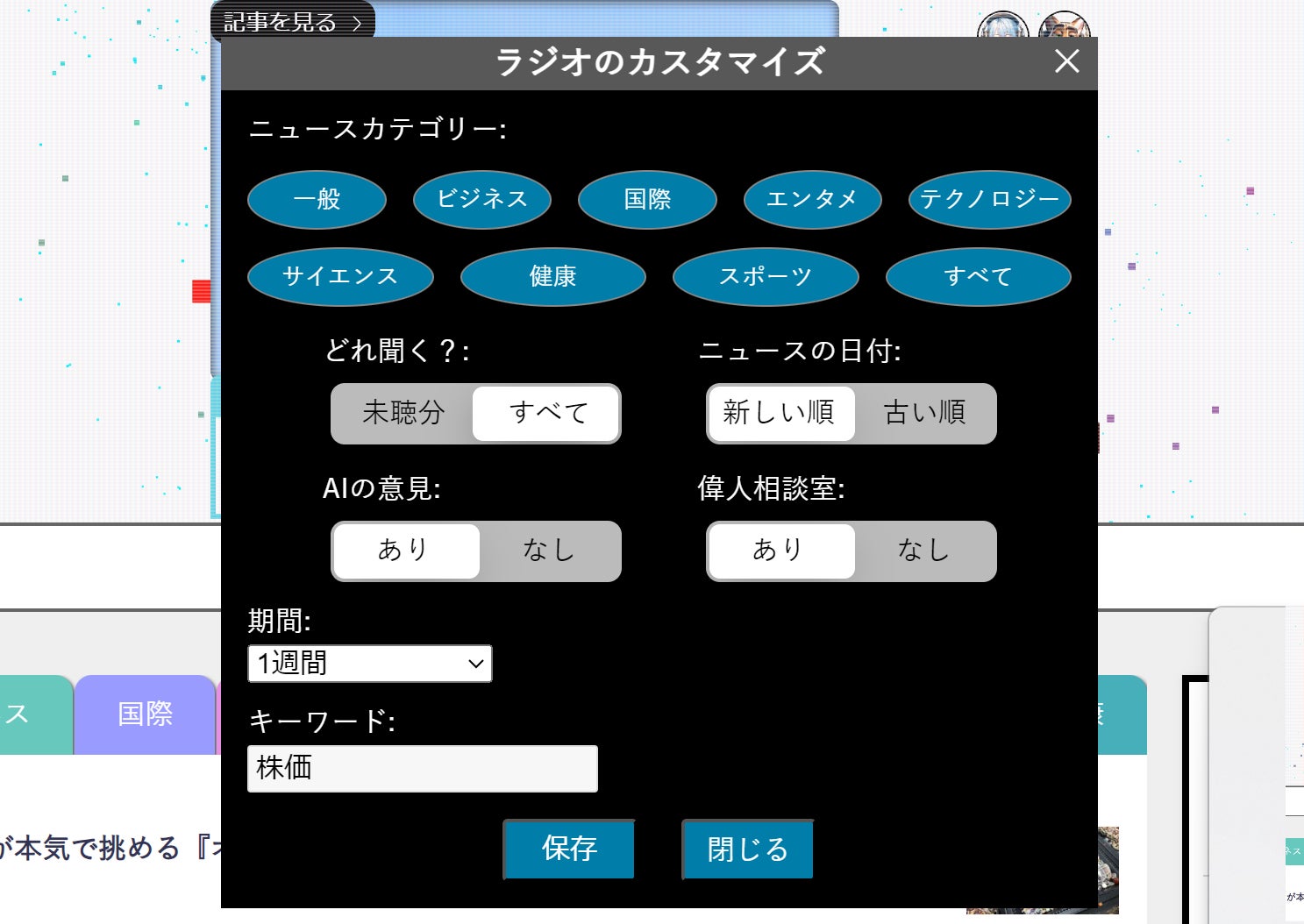 各分野の偉人AI達による視点でニュースを見たり、「ニュースラジオの構成」を自分でカスタマイズできたりと、AIならではの機能を有しています。