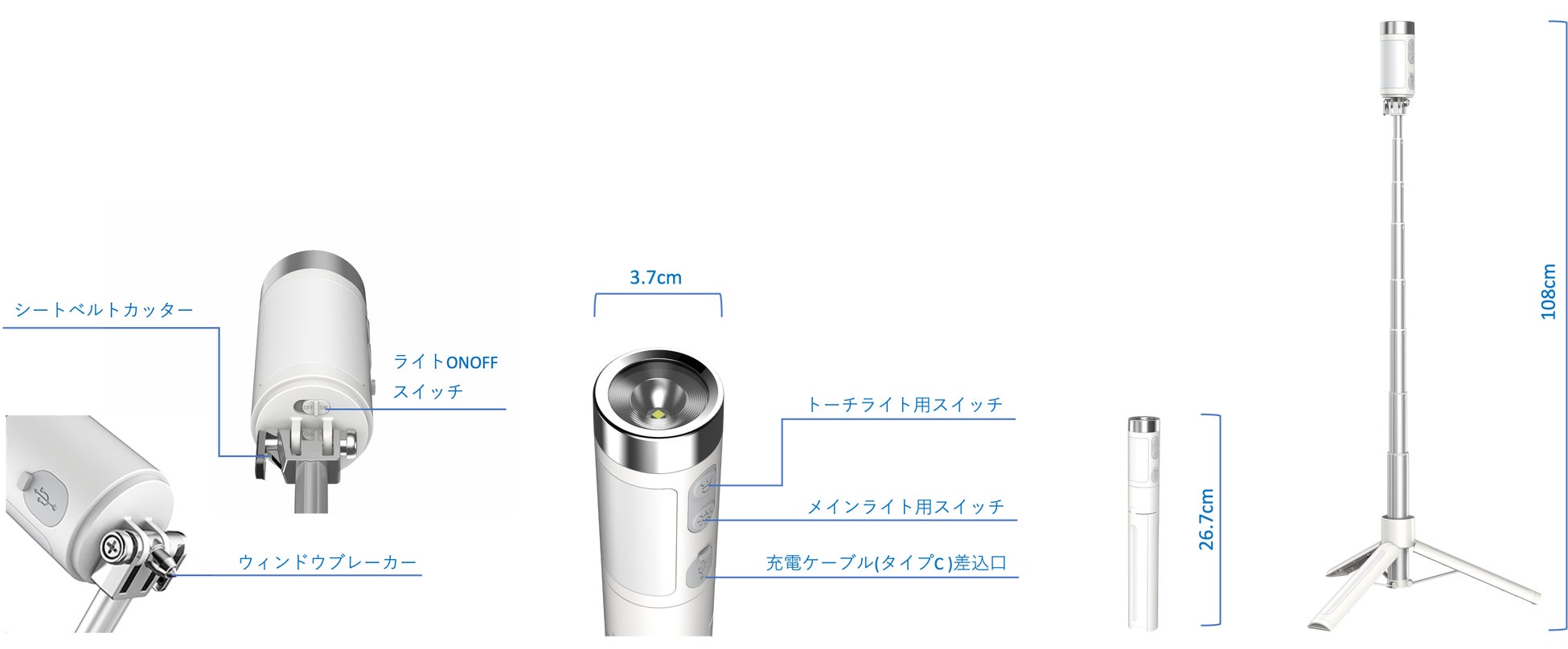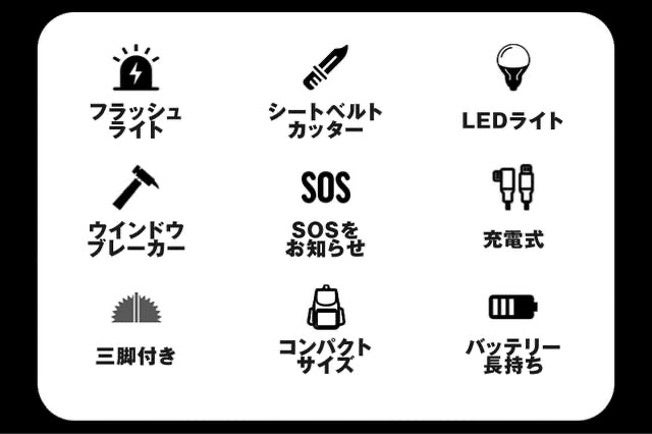 ウィンドウブレーカー・シートベルトカッター・フラッシュライト・トーチライトを搭載した多機能4wayライト