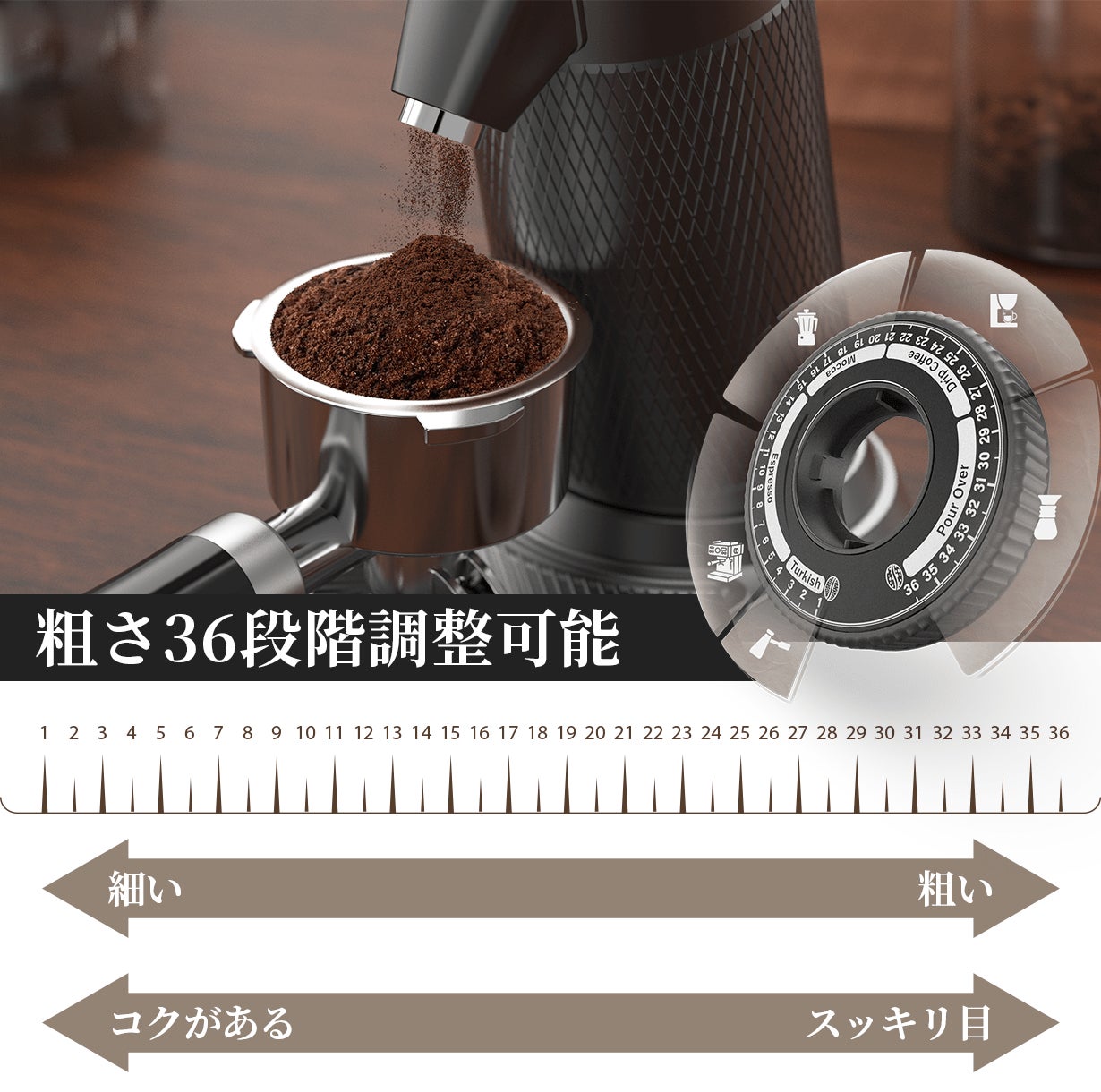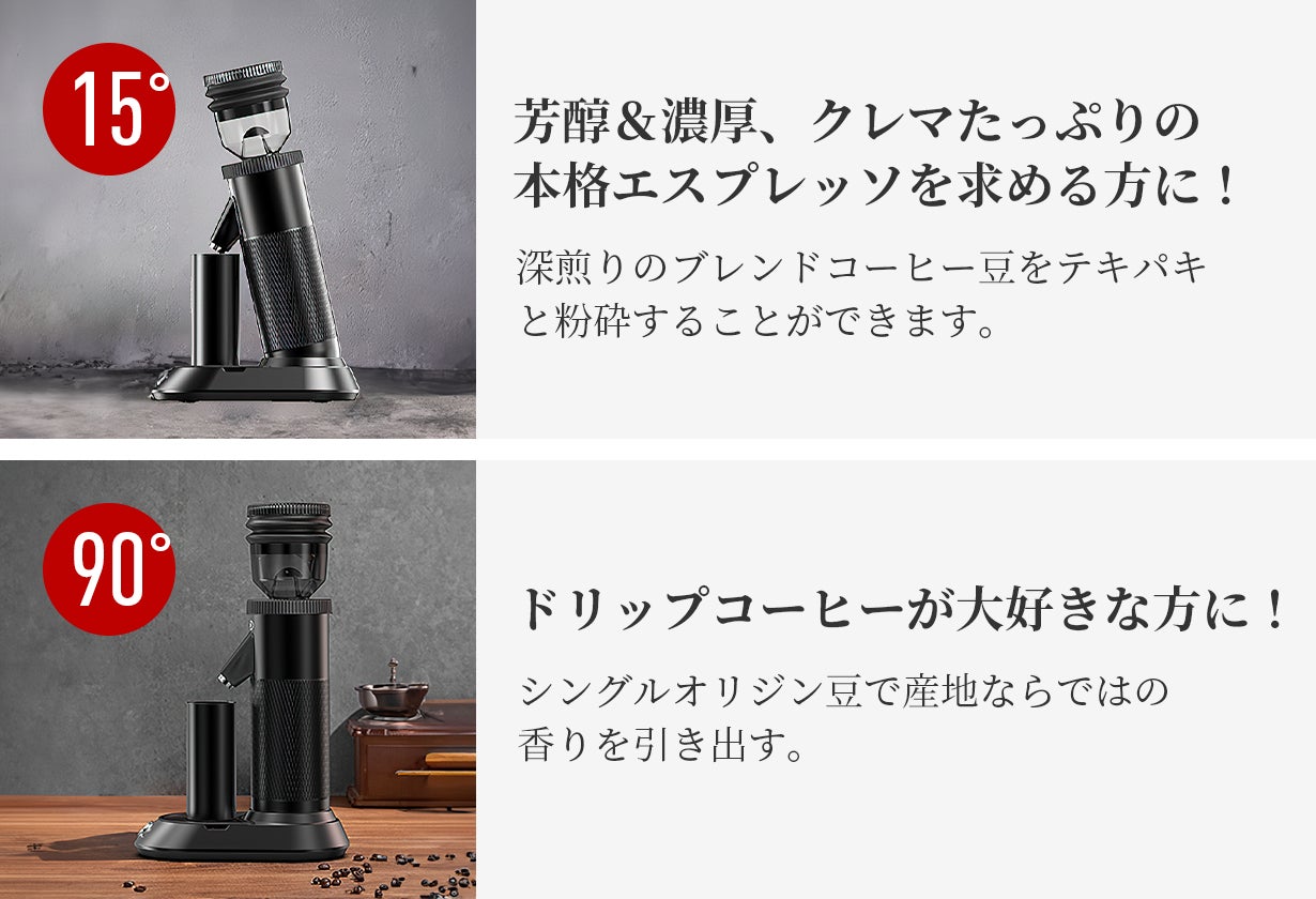 コーヒー豆の個性を最大限に引き出すために、豆を挽く角度を90°と15°で調整可能。