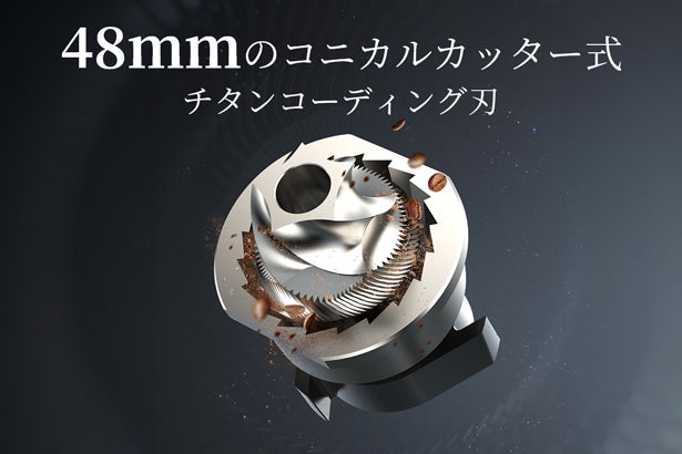 効率的な粉砕機能を持つ五軸48mmのコニカルカッター式チタンコーディング刃を採用。摩擦熱が少ないためコーヒー粉が酸化しにくく、味と風味を最大限まで引き出します。