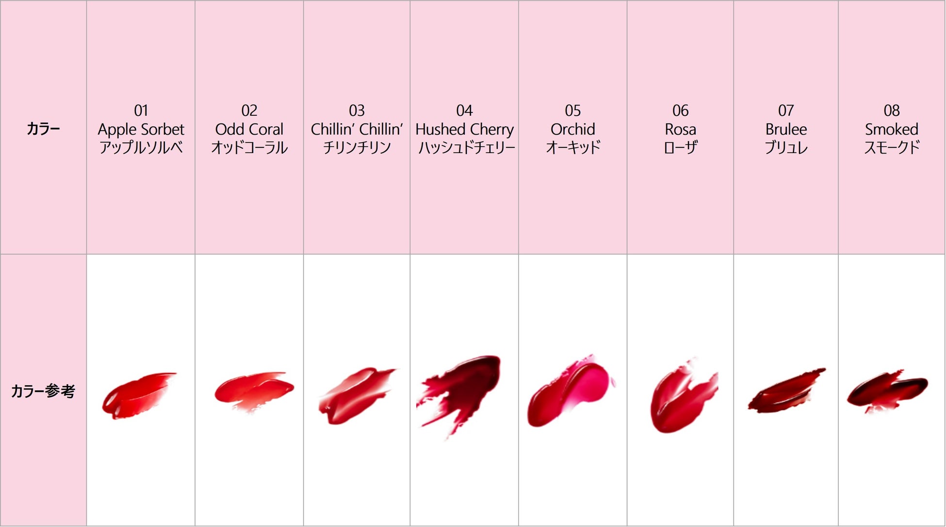 ジューシーな果実からインスピレーションを得たブライトトーンの生き生きとしたカラーが唇に密着し、グレイズ立体コーティング完成。