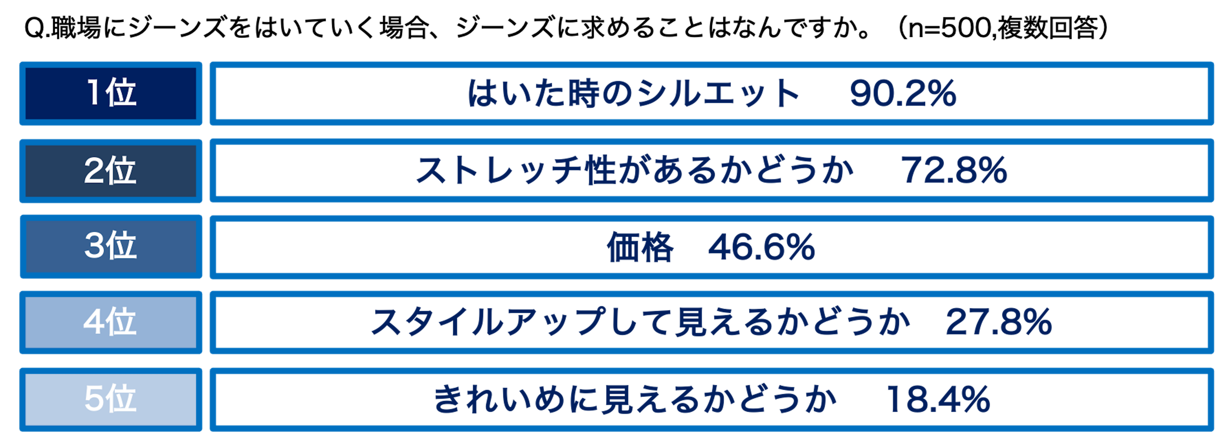 職場にはいていくジーンズに求めることランキングTOP5は、「はいた時のシルエット(90.2%)」、「ストレッチ性があるかどうか(72.8%)」、「価格(46.6%)」、「スタイルアップして見えるかどうか(27.8%)」、「きれいめに見えるかどうか(18.4%)」という結果に。
