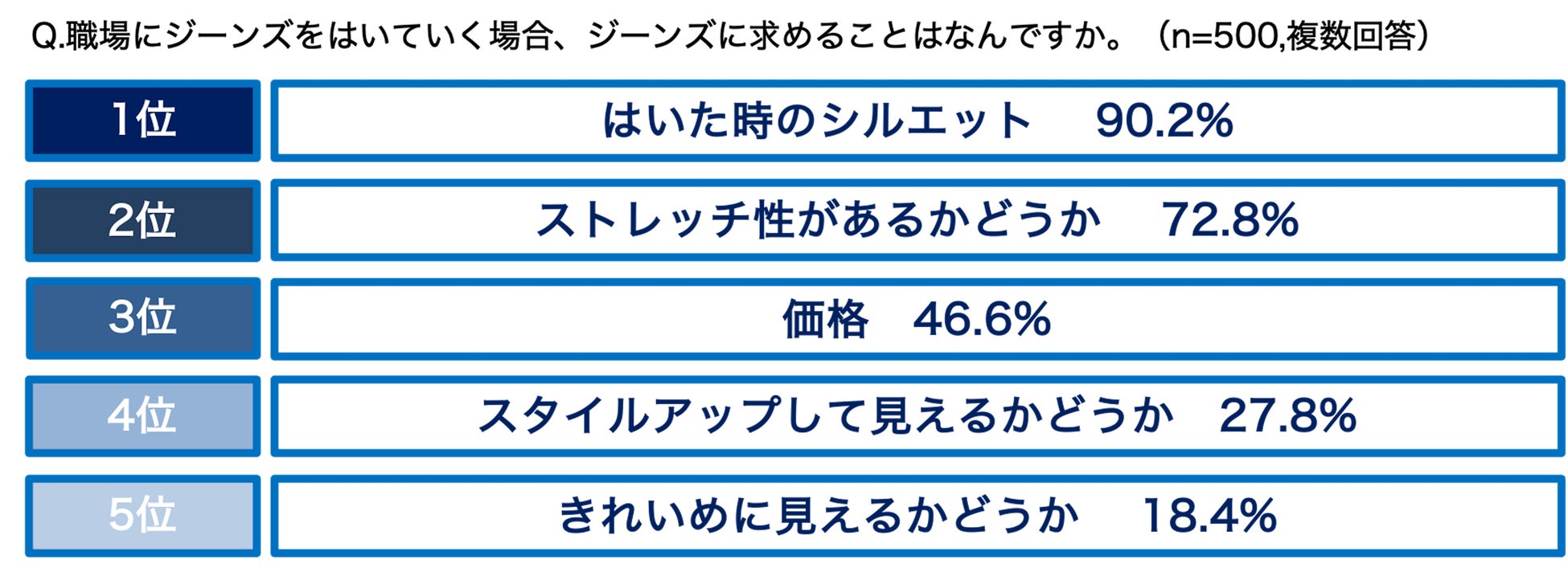3.職場にはいていくジーンズに求めることランキングTOP5は、「はいた時のシルエット(90.2%)」、「ストレッチ性があるかどうか(72.8%)」、「価格(46.6%)」、「スタイルアップして見えるかどうか(27.8%)」、「きれいめに見えるかどうか(18.4%)」という結果に。