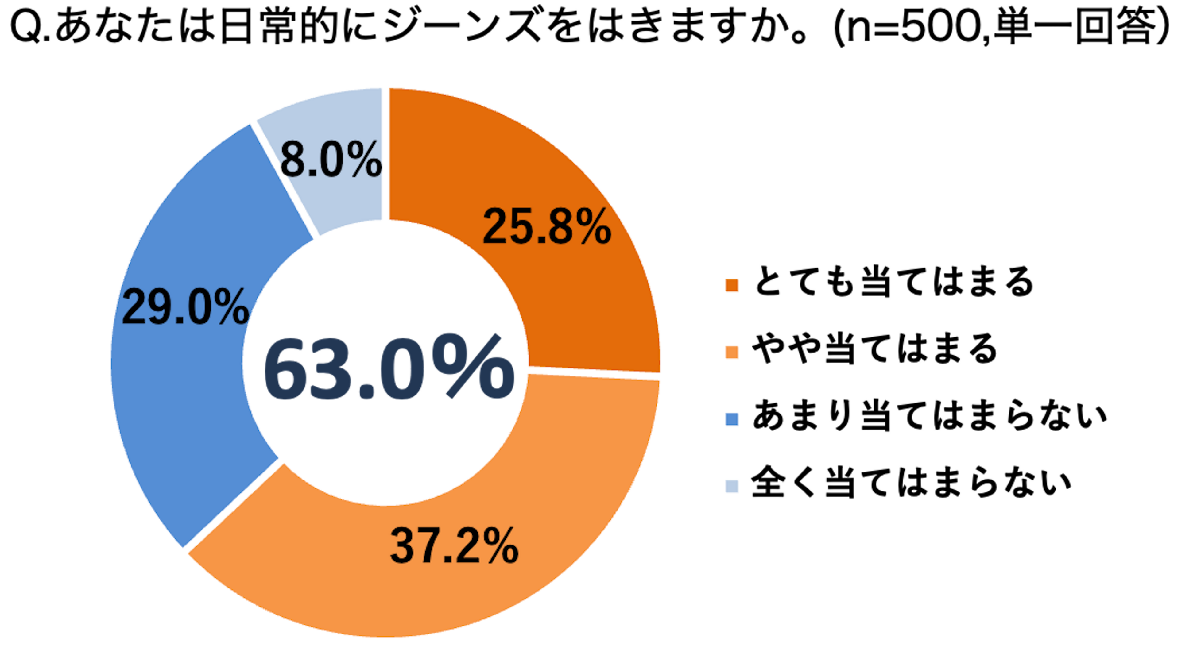 1. 日常的にジーンズをはいている人は6割(63.0%)を超える結果に。全体の約5割(50.6%)が職場にジーンズをはいていきたいと回答した一方、実際に職場にはいていっている人は、はいていきたいと回答した約半数(28.2%)にとどまることが判明。
