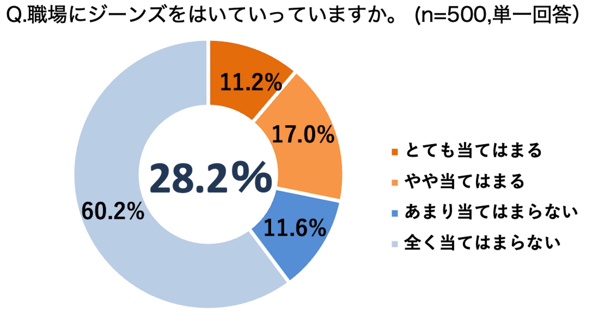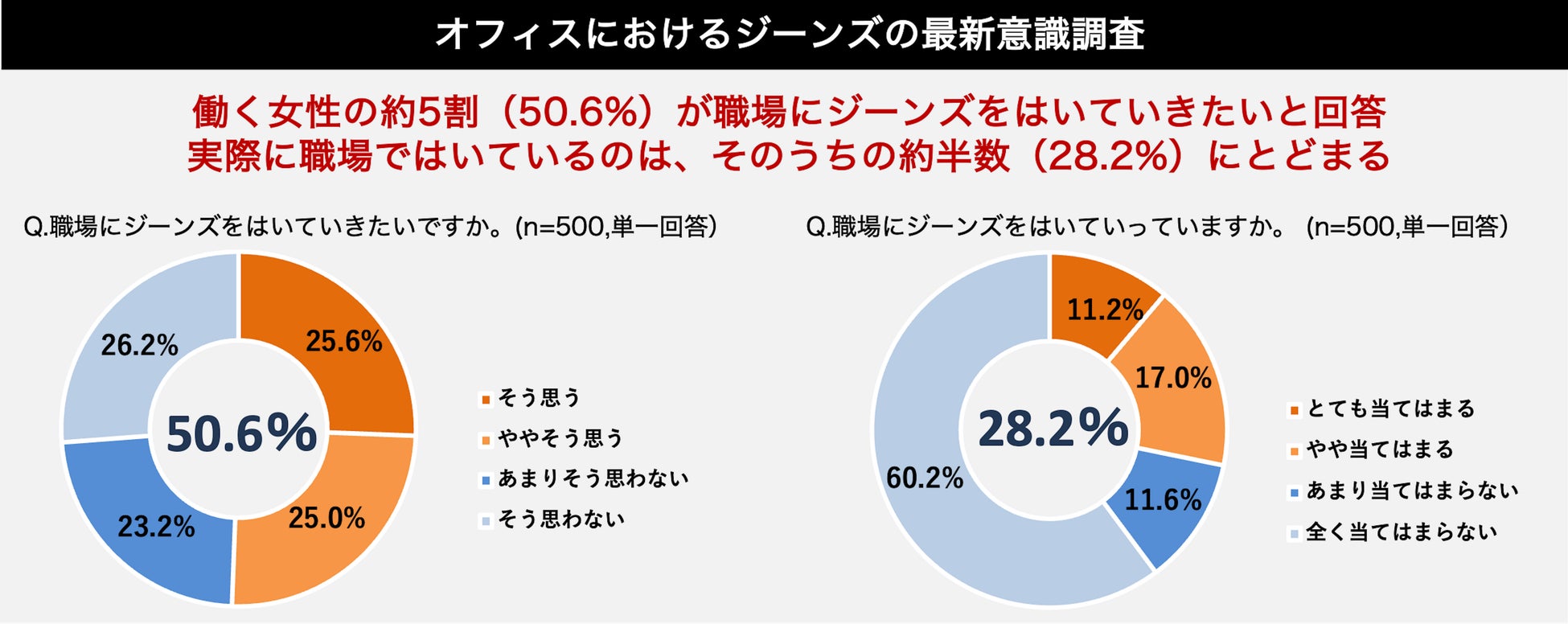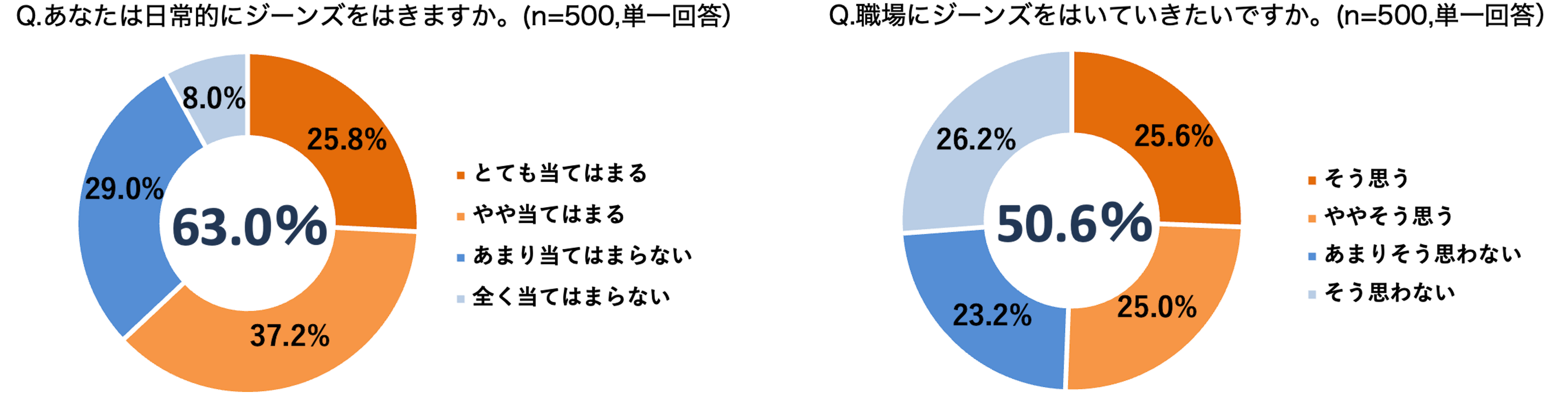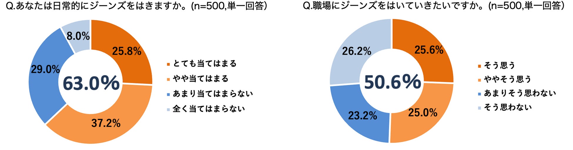 日常的にジーンズをはいている人は6割(63.0%)を超える結果に。全体の約5割(50.6%)が職場にジーンズをはいていきたいと回答した一方、実際に職場にはいていっている人は、はいていきたいと回答した約半数(28.2%)にとどまることが判明。