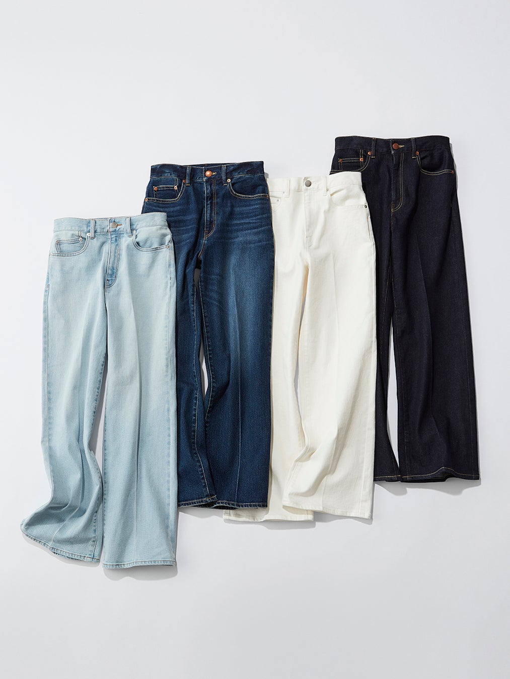 美脚デザインを追求し、「スティックジーンズ」と「ハイライズワイドジーンズ」の2つのシルエットを開発。美脚見えするために重要なセンタープレスは、レーザー加工で陰影を付ける手法を採用(※ホワイトは除く)することで、脚を立体的に見せ、美脚シルエットを叶えます。