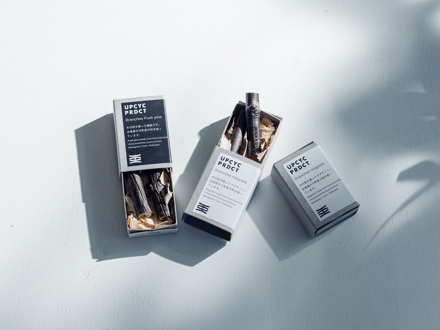 北海道中川町産の木の枝を使ったマグネットとプッシュピンです。パッケージの箱も、印刷所で捨てられていた紙を利用して作られています。さまざまな樹種の枝をご用意しています。