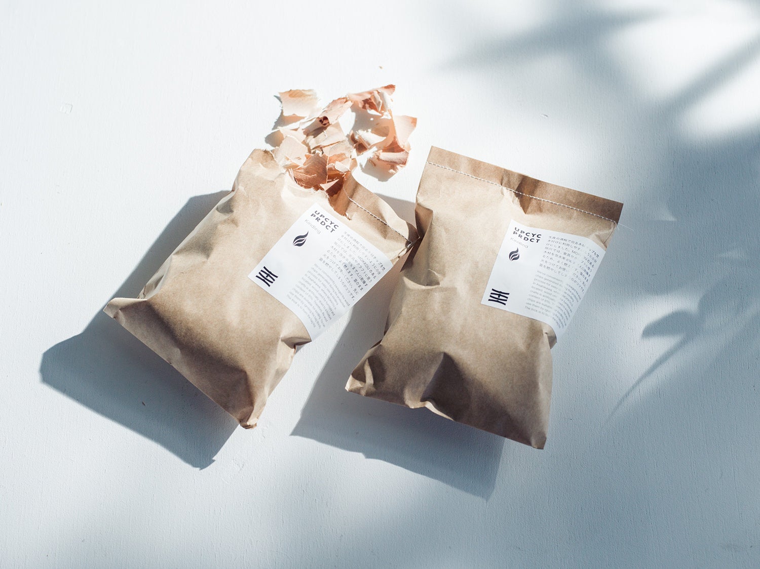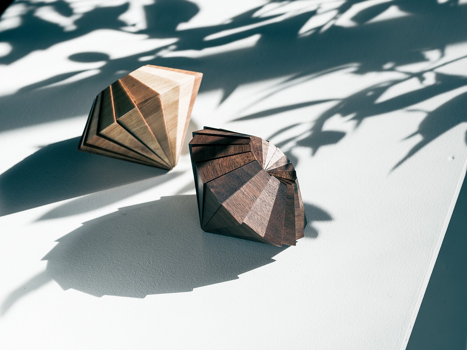 アップサイクルプロジェクトの第一弾製品。製造の過程で出る端材を使ったオブジェです。パッケージや緩衝材も捨てられていた紙や木屑を使い、プロジェクトの象徴的な製品になっています。