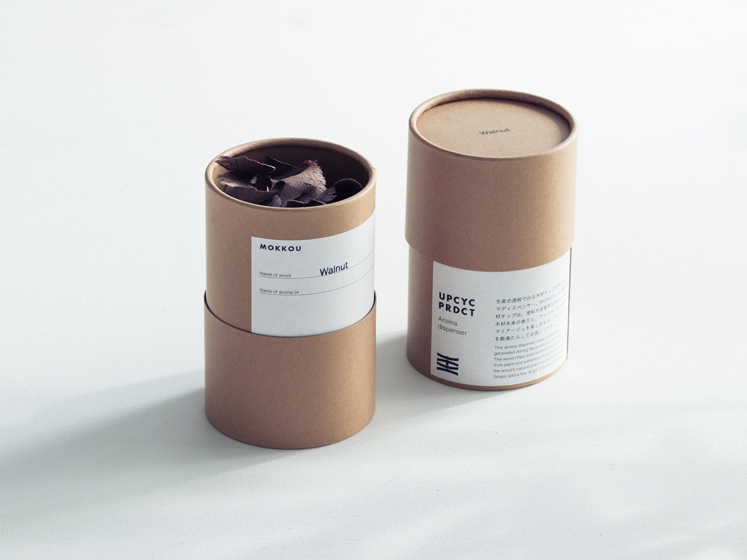 生産の過程で出る木材チップを使ったアロマディフューザー。MOKKOUの工場の木材チップは、塗料や接着剤を含みません。木材本来の香りと、アロマオイルの香りのマリアージュを楽しめます。メープル、ウォルナット、チェリーの3つの樹種を用意しました。