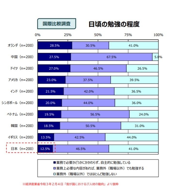 現に経済産業省から令和3年2月4日に公開された「我が国におけるIT人材の動向」の海外比較の中でも日本のIT人材の勉強時間が最も短いと指摘されています。