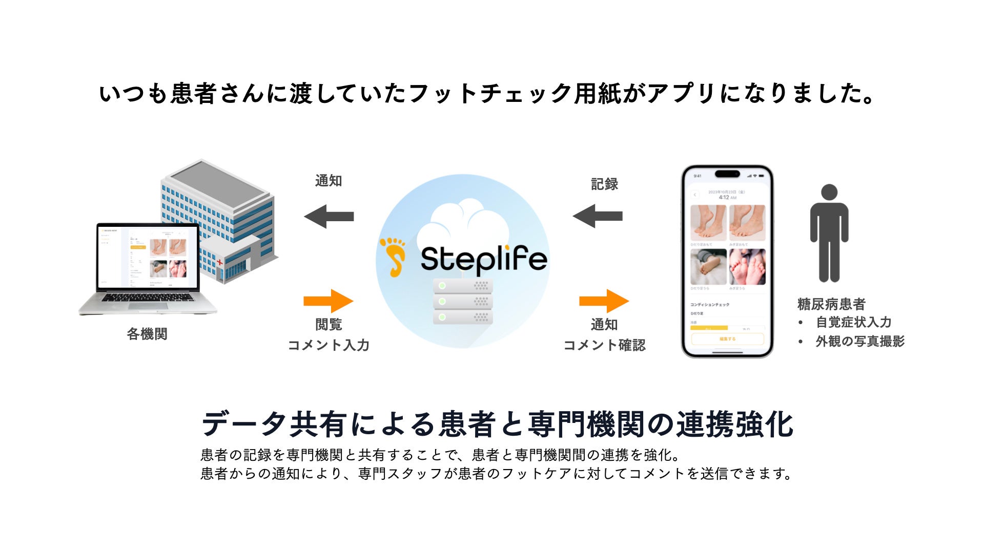『Steplife』は、糖尿病患者がスマートフォンのカメラを使用して足の状態を定期的にチェックし、専門機関と患者の連携を強化することで、足病の早期発見や患者の自己管理能力の向上、現場の労力削減を目指します。この革新的なアプリで足切断を防ぐ未来への貢献を目指しています。